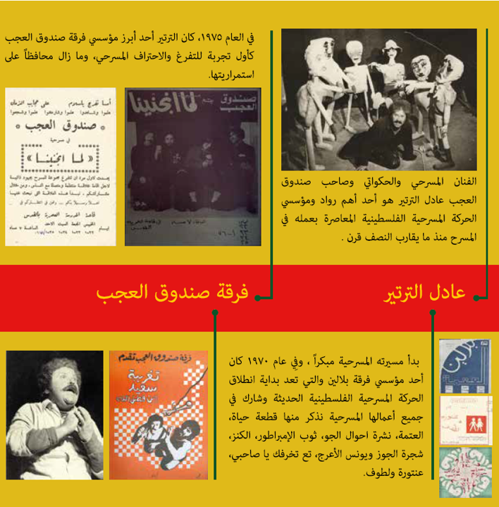 يهدف هذا الكتاب إلى توثيق بعض العناصر الرئيسية التي ينطوي عليها تاريخ الحركة المسرحيّة الفلسطينيّة المعاصرة من العام ١٩٦٧ حتى اليوم من منظور الفنان المسرحي عادل الترتير، أحد مؤسّسي الحركة المسرحيّة الفلسطينيّة. شارك الترتير، المعروف أيضًا باسم أبو العجب، في تأسيس فرقة بلالين ومسرح صندوق العجب في العامَين ۱۹۷۰و ۱۹۷٥ على التوالي، ولا يزال ناشطًا في مجال العمل المسرحي حتى يومنا هذا. وتُشكلّ رحلة هذه الفِرَق، ومسارات الترتير الحياتيّة والمسرحيّة، المحور الرئيسي لهذا الجهد البحثي. هذا الكتاب، والذي يعكس أيضاً بعضاً من التأملات الذاتية للترتير في محطات مسرحية مختارة بعد رحلة زادت عن النص قرن على خشبة المسرح، هو نتاج للمقابلات المعمَّقة التي أجريت مع الترتير والتي تزامنت مع معاينة أرشيفاته المسرحيّة الفريدة. ترافق عادل الترتير مع ابنه علاء لكتابة هذا الكتاب والانخراط بهذا الجهد البحثي التوثيقي، وحصل علاء على منحة الصندوق العربي للثقافة والفنون (آفاق) والمجلس العربي للعلوم الاجتماعية ضمن برنامج البحوث حول الفنون (الدورة الثالثة) من أجل القيام بهذا الجهد البحثي الفني الكتابي الأرشيفي