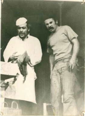 على اليمين: صورة من مسرحية الكنز يظهر فيها عادل الترتير وزكريا شاهين، مسرح المدرسة العمرية، القدس،۱۹۷۳
