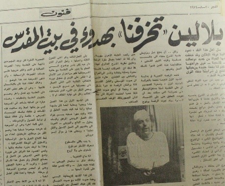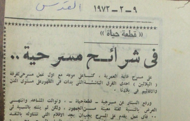 على اليسار: صورة لمقالة نشرت في جريدة القدس كتبها عطية أبو رميلة حول مسرحية قطعة حياة، ۹ شباط ۱۹۷۲