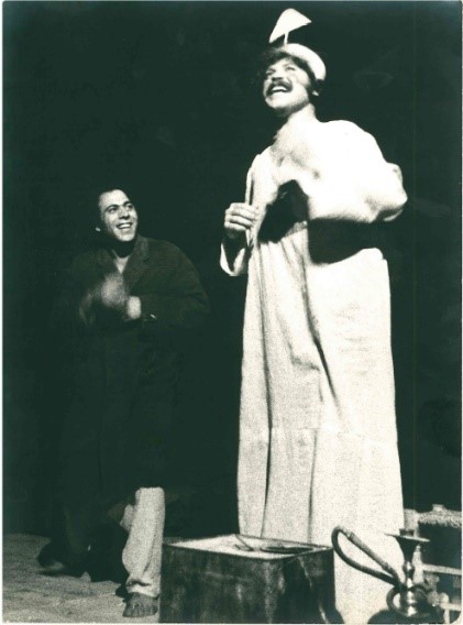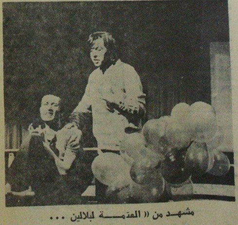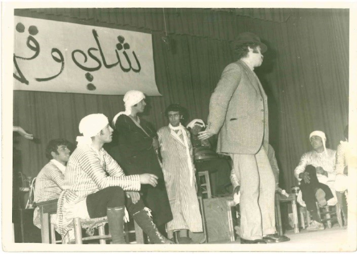 في الوسط: صورة من مسرحية عنتورة ولطوف، مسرح جمعية الشبان المسيحية، القدس،۱۹۷٥