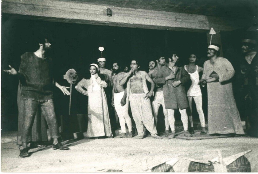 على اليسار: صورة من مسرحية الكنز، مسرح المدرسة العمرية، القدس،۱۹۷۳