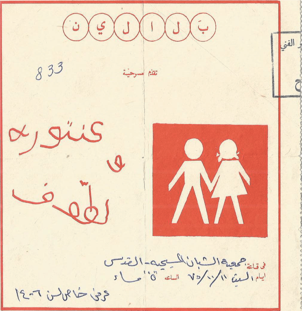في الوسط: صورة لتذكرة أصلية لمسرحية عنتورة ولطوف من مسرحية عنتورة ولطوف،۱۹۷٥