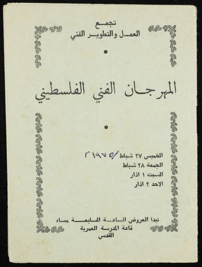 دليل “المهرجان الفني الفلسطيني” صادر عن تجمع العمل والتطوير الفني، 1975