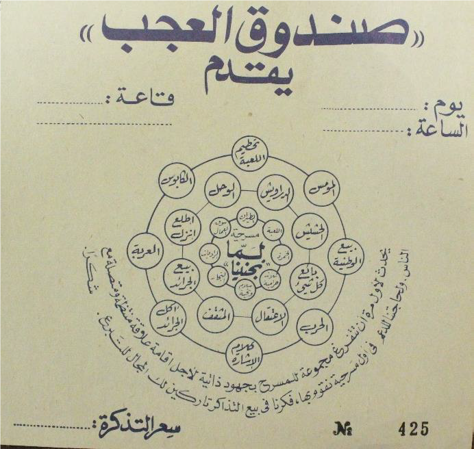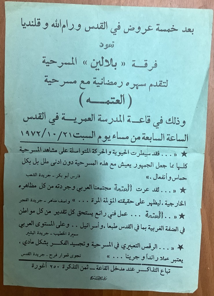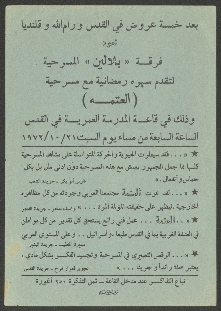 تذكرة الدخول لمسرحية “العتمة”، رام الله، 28 أيلول 1972
