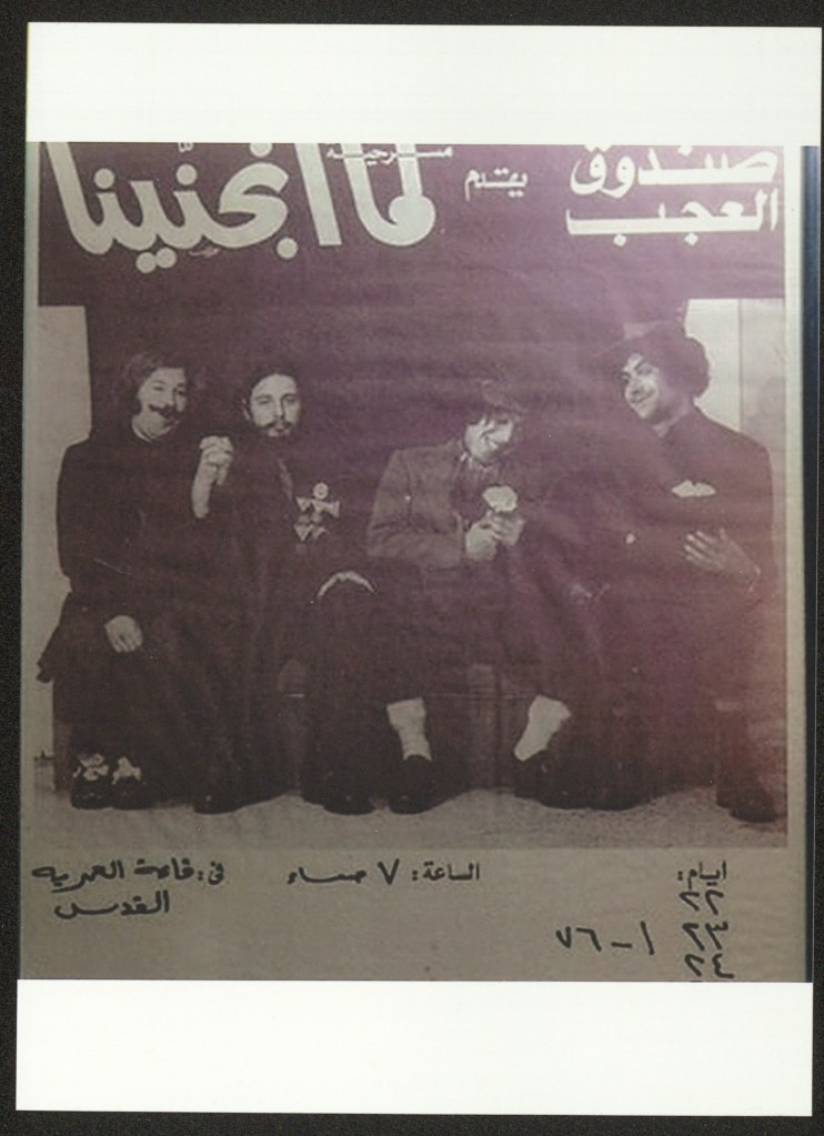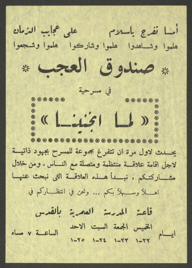 “صندوق العجب يقدم مسرحية لمّا انجنينا”، ملصق صادر عن صندوق العجب، القدس، 1976