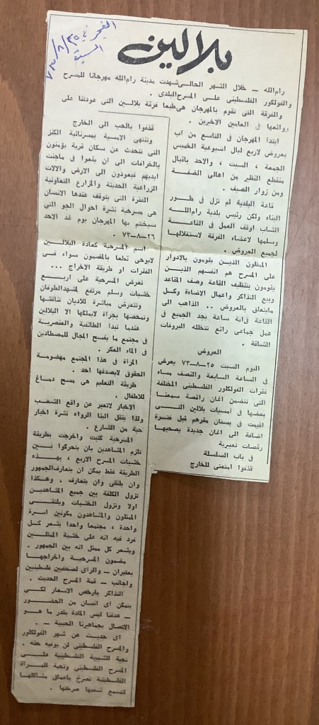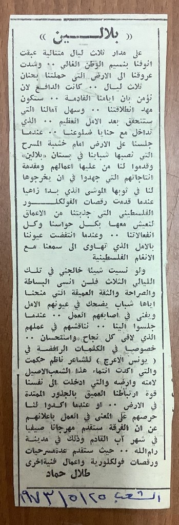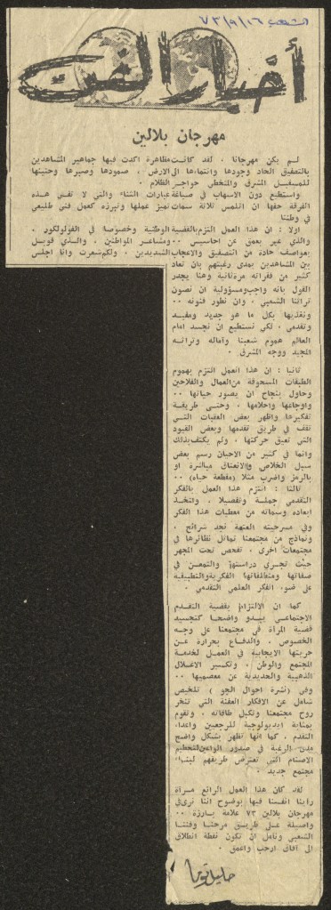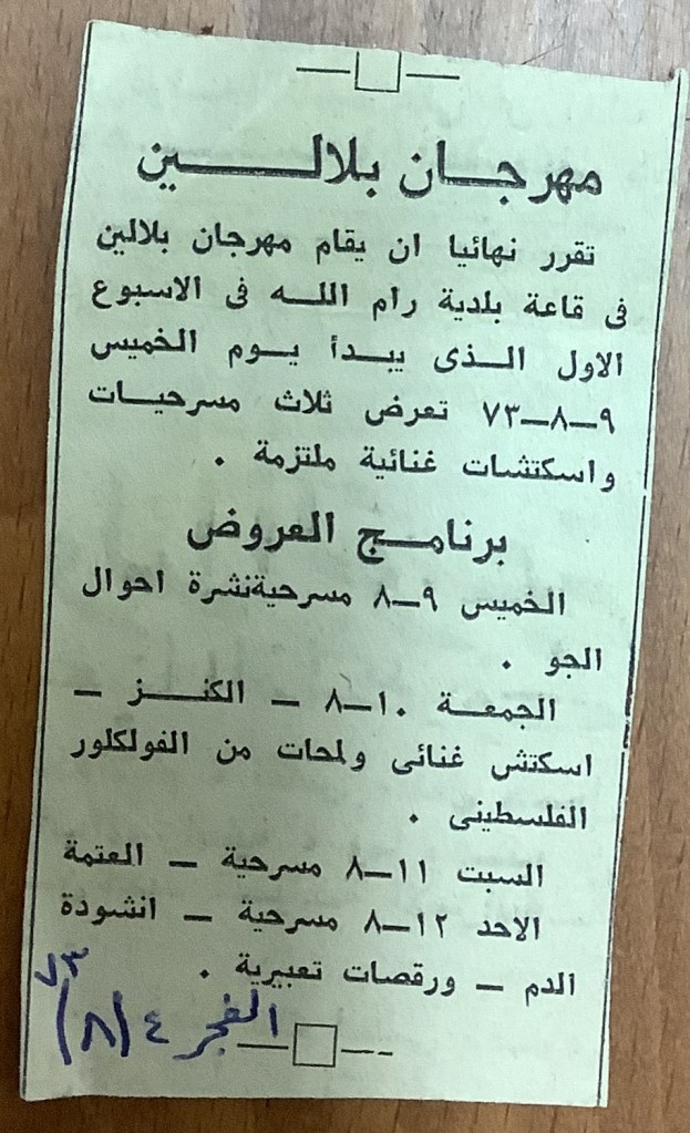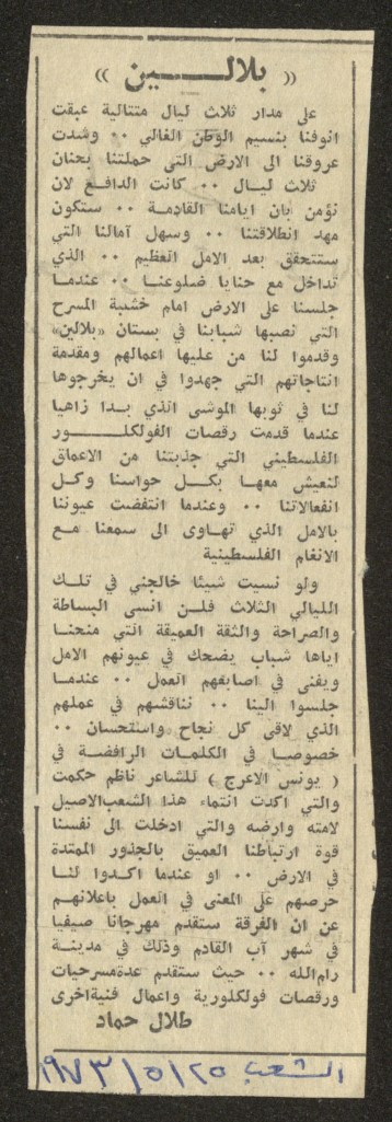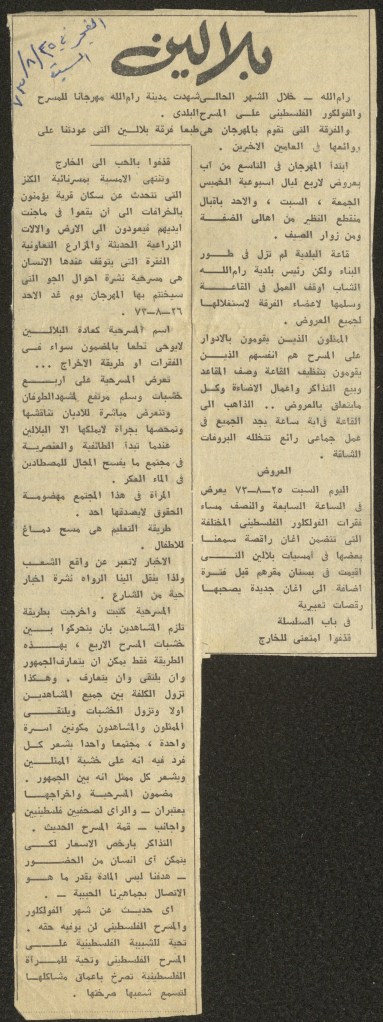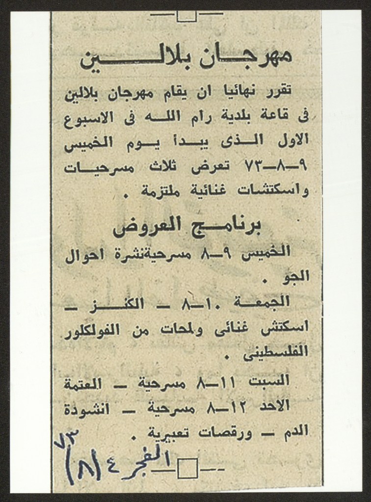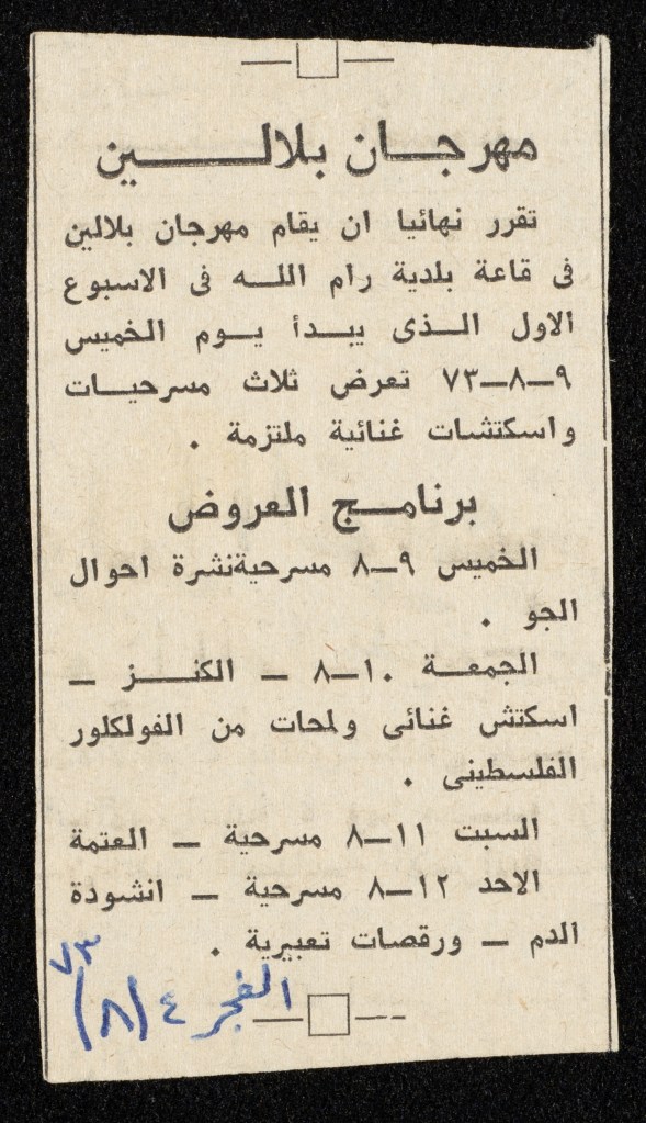 “بلالين 73 – شهر المسرح والفلكلور الفلسطيني”، قصاصة ورقية صادرة عن صحيفة الفجر، 4 آب 1973