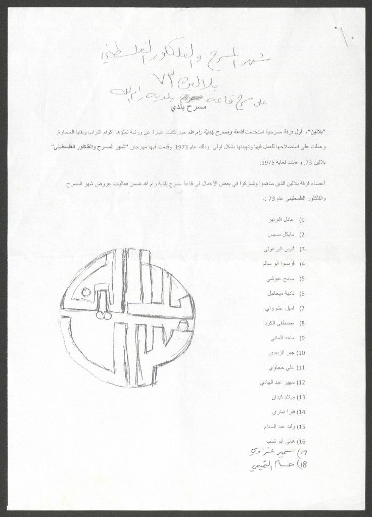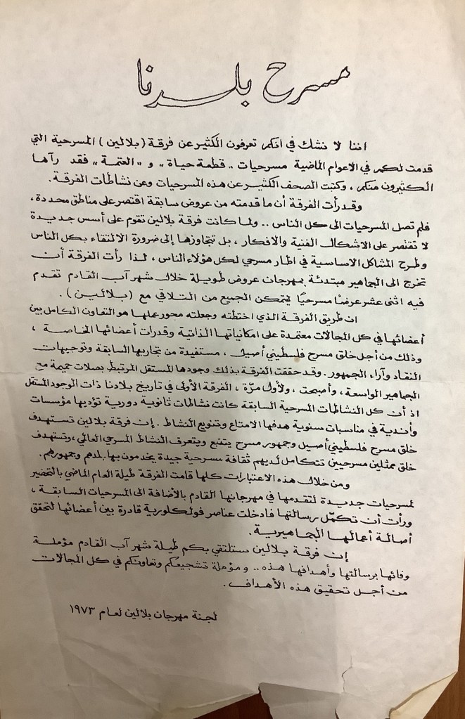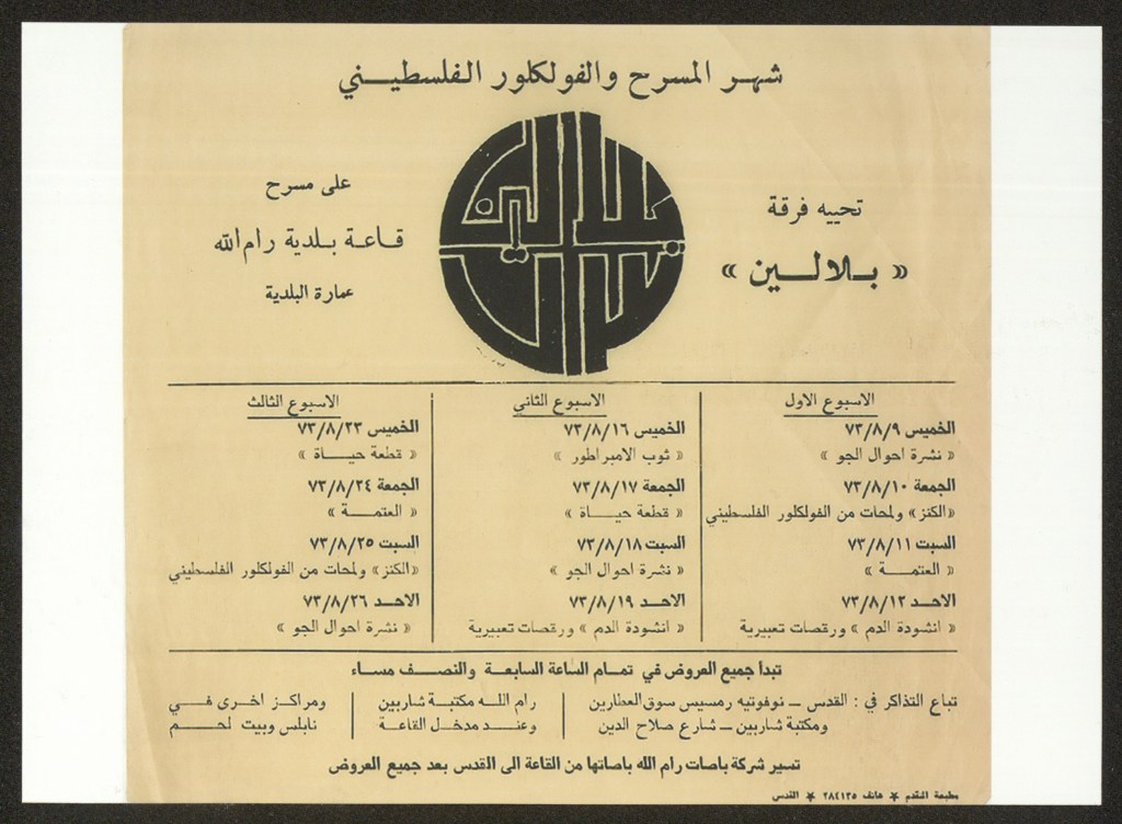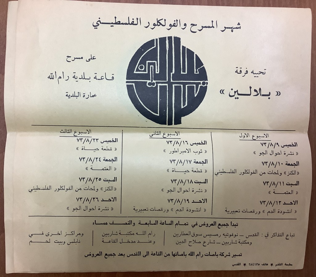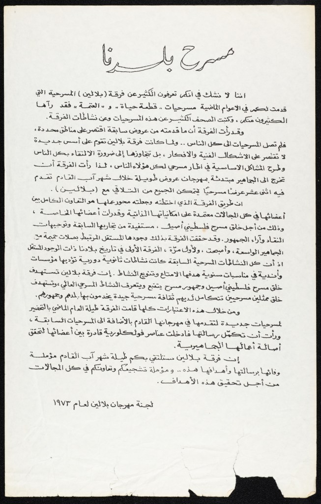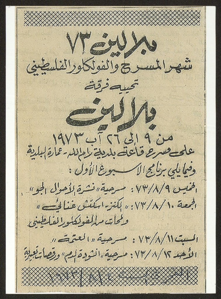 “بلالين 73 – شهر المسرح والفلكلور الفلسطيني”، قصاصة ورقية صادرة عن صحيفة الفجر، 4 آب 1973