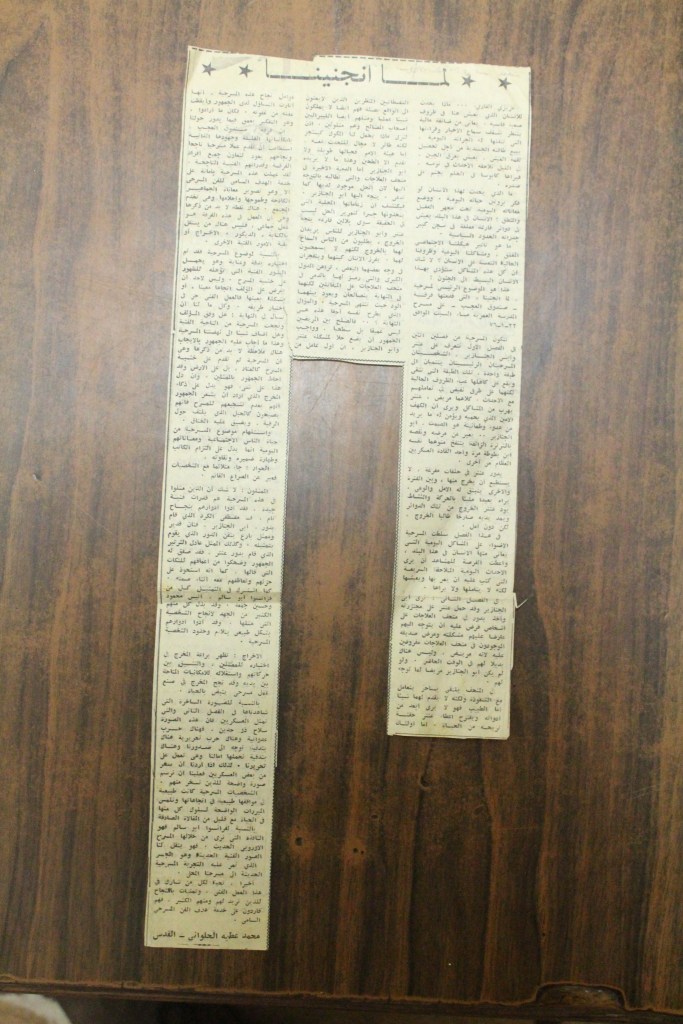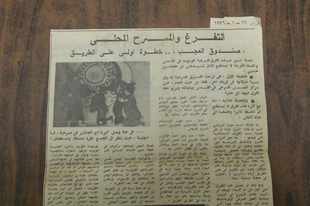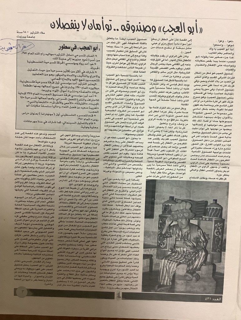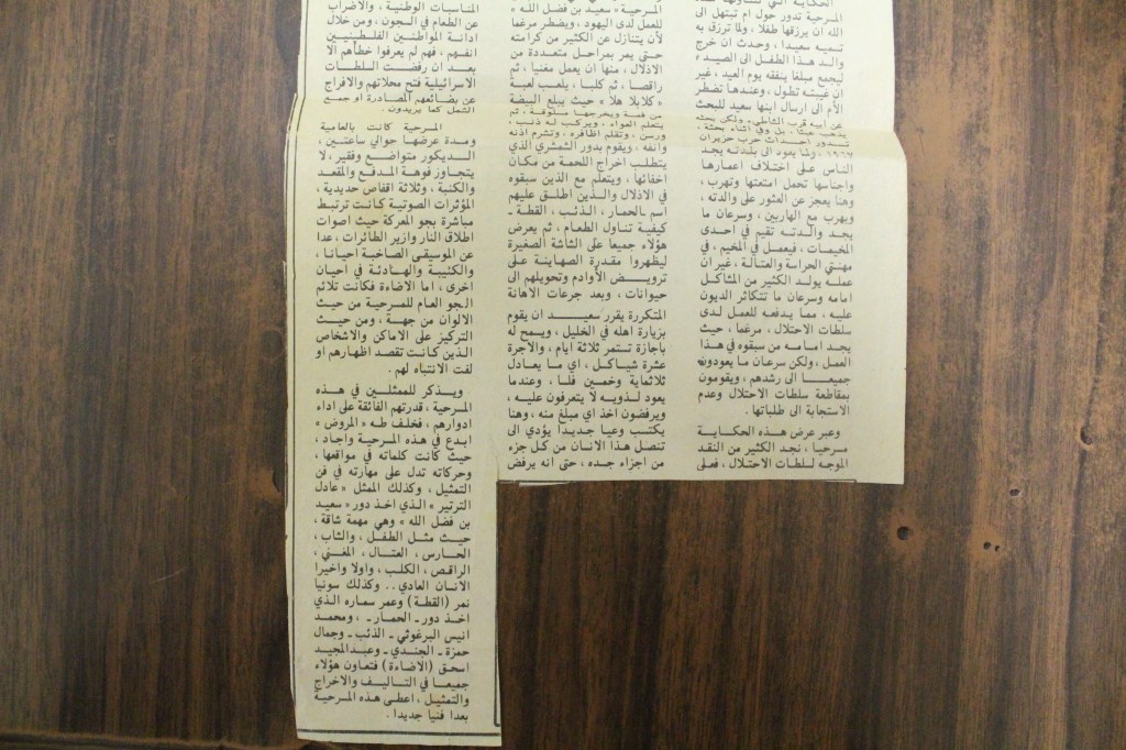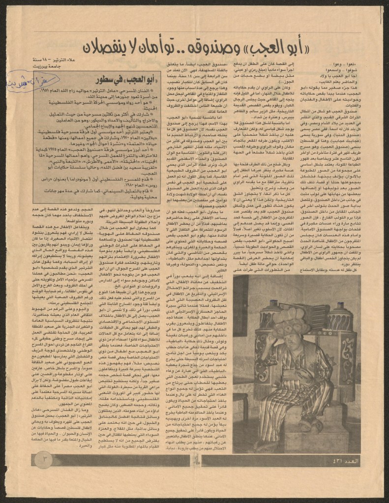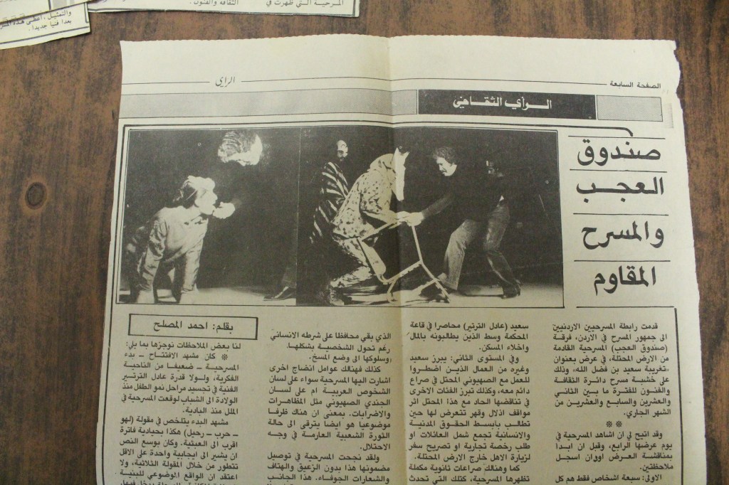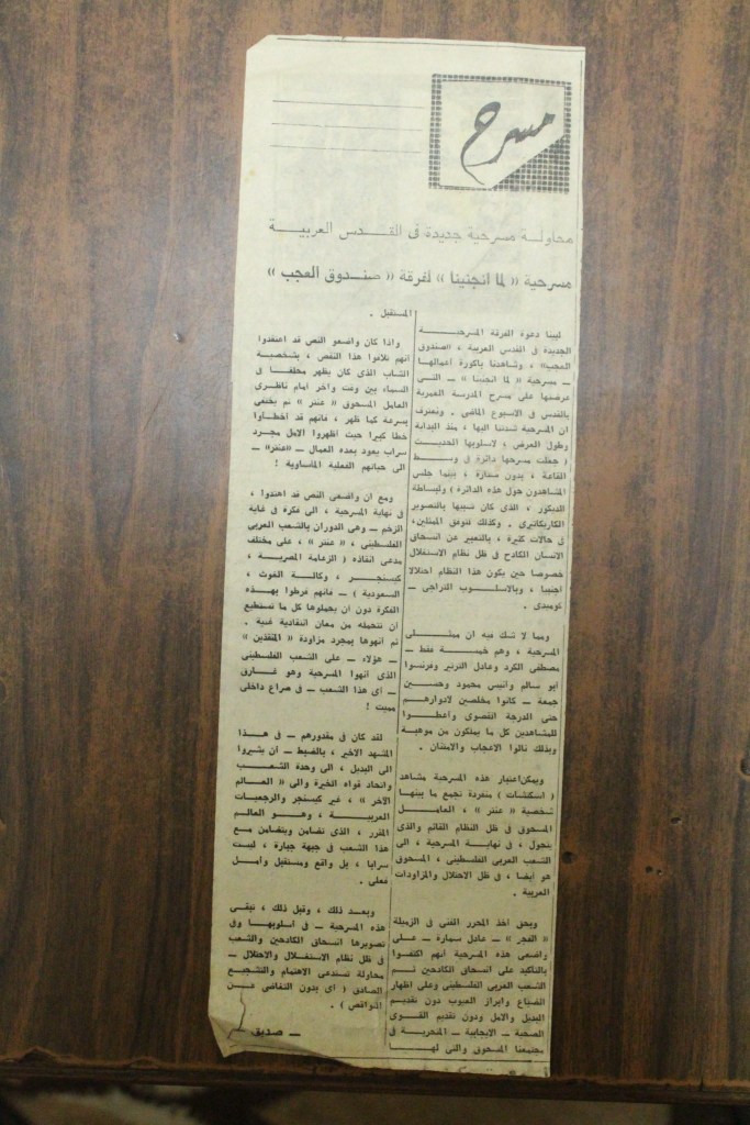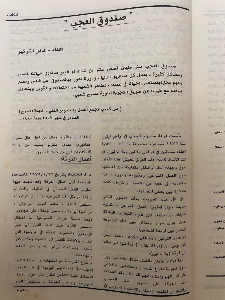 “واقع الحركة المسرحية في الأراضي المحتلة”، قصاصة من جريدة، 15 شباط 1980 مجموعة عادل الترتير 15 فبراير 1980 “صاحب آخر صندوق عجب في العالم”، قصاصة من جريدة، 6 تموز 2013