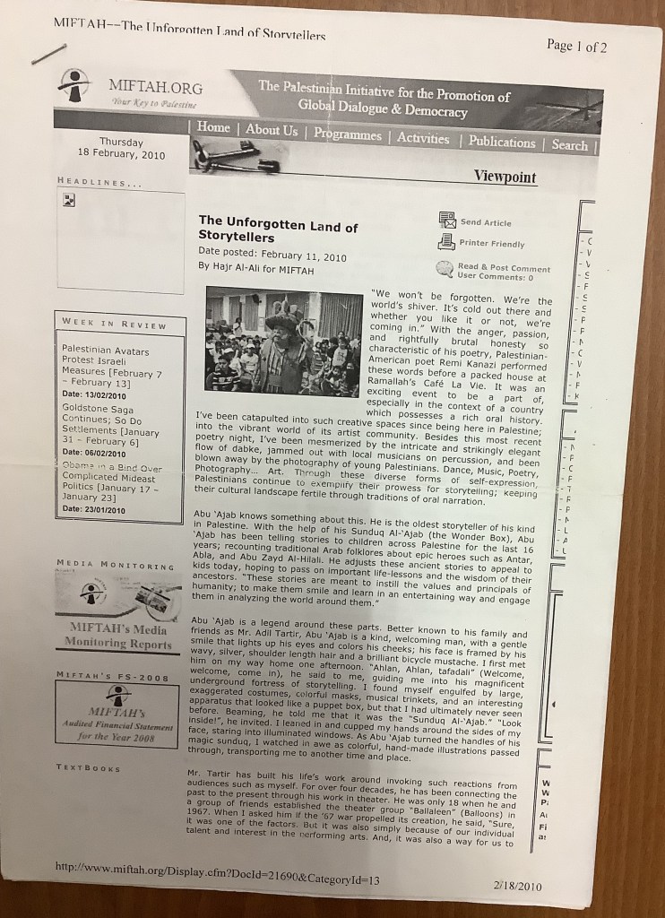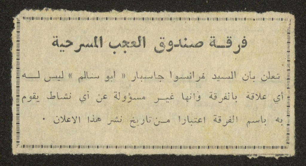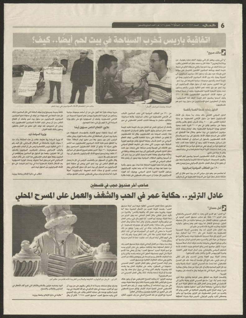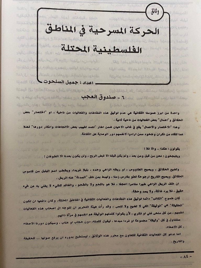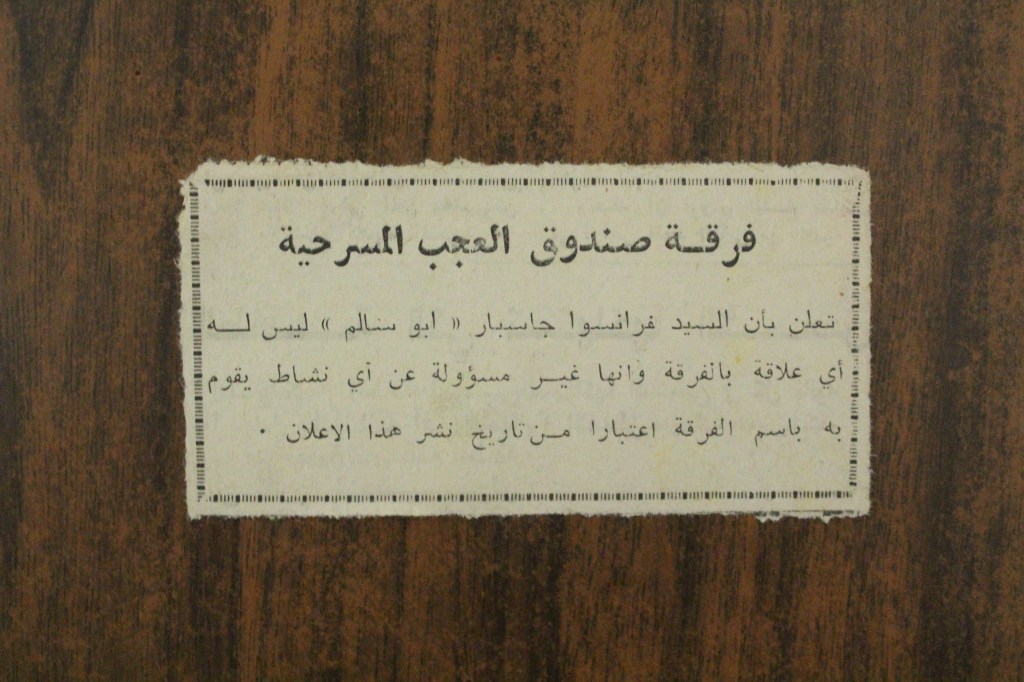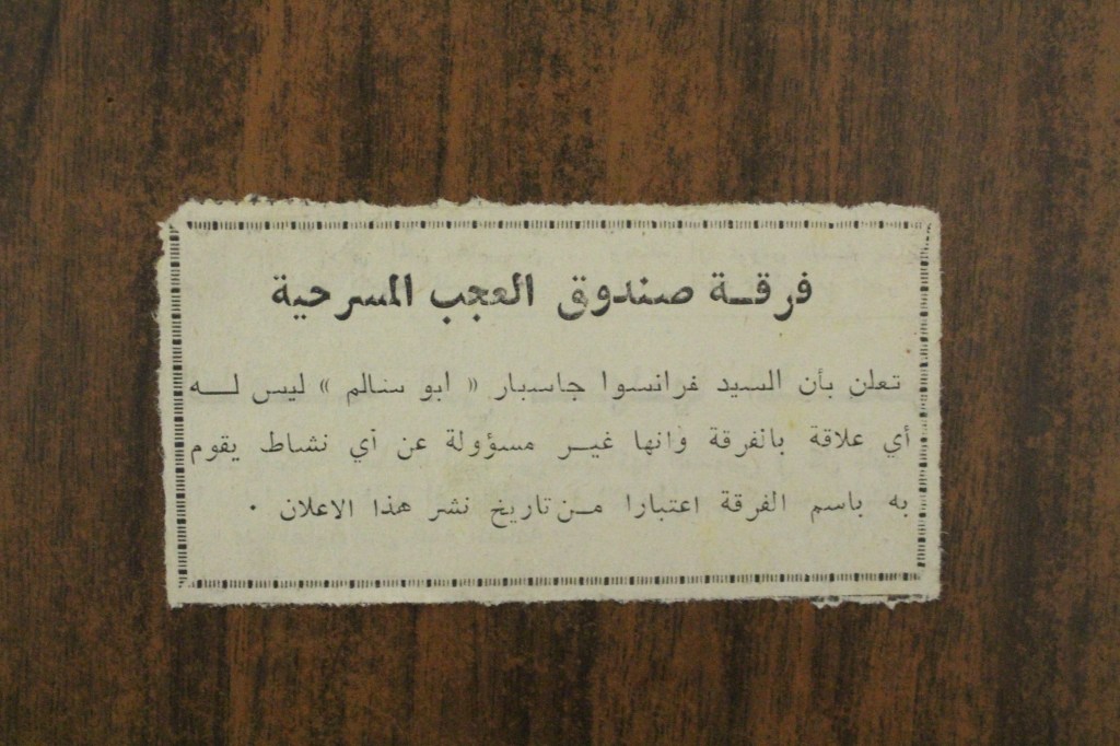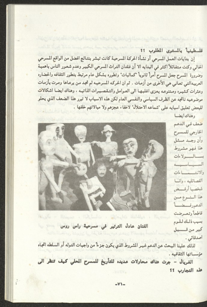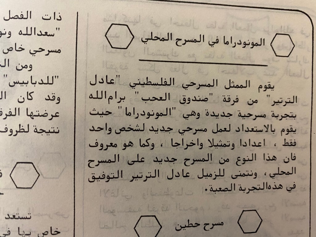 “واقع الحركة المسرحية في الأراضي المحتلة”، قصاصة من جريدة، 15 شباط 1980 مجموعة عادل الترتير 15 فبراير 1980 “صاحب آخر صندوق عجب في العالم”، قصاصة من جريدة، 6 تموز 2013