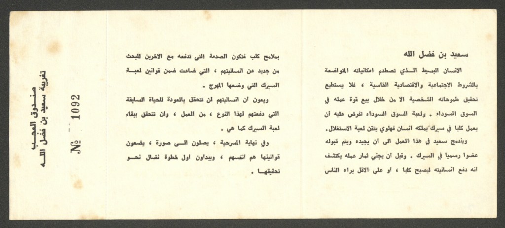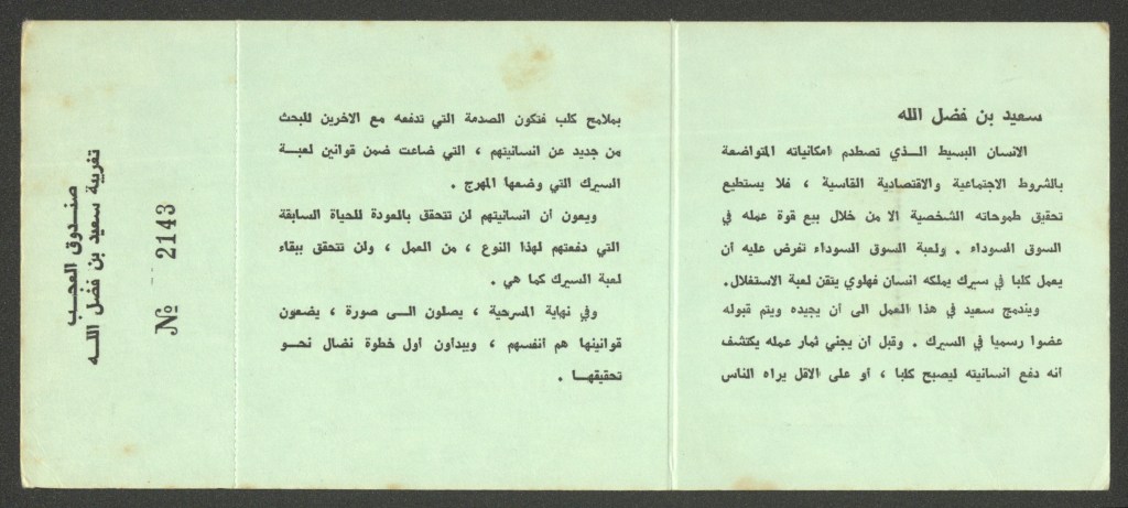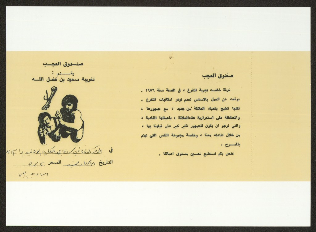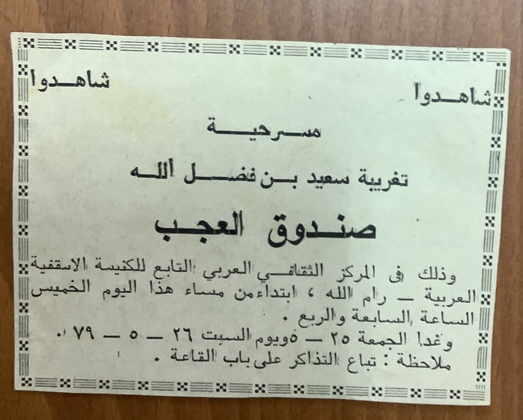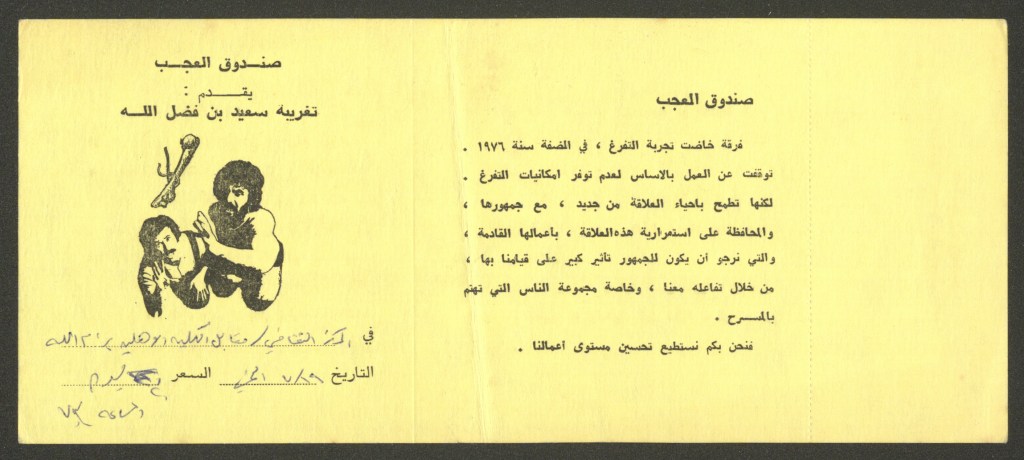 تذكرة الدخول لمسرحية “تغريبة سعيد ابن فضل الله”، رام الله، 19 تموز 1979