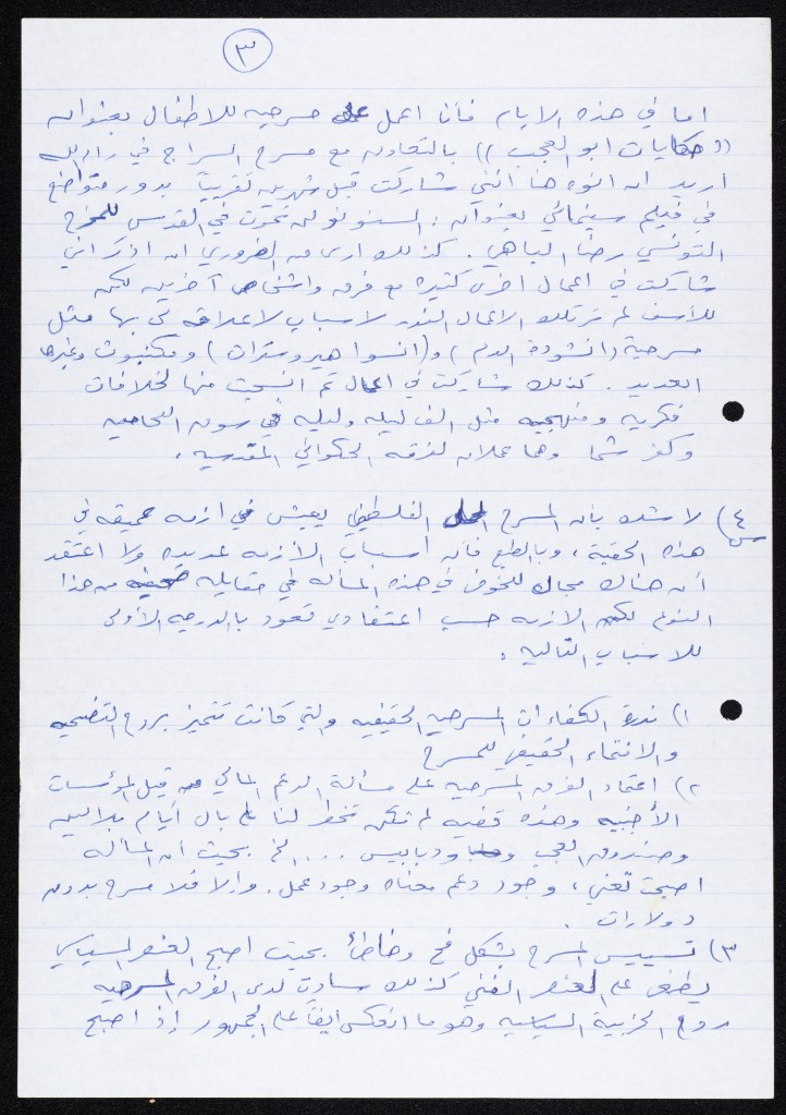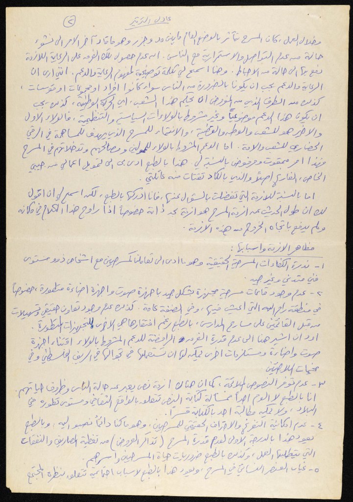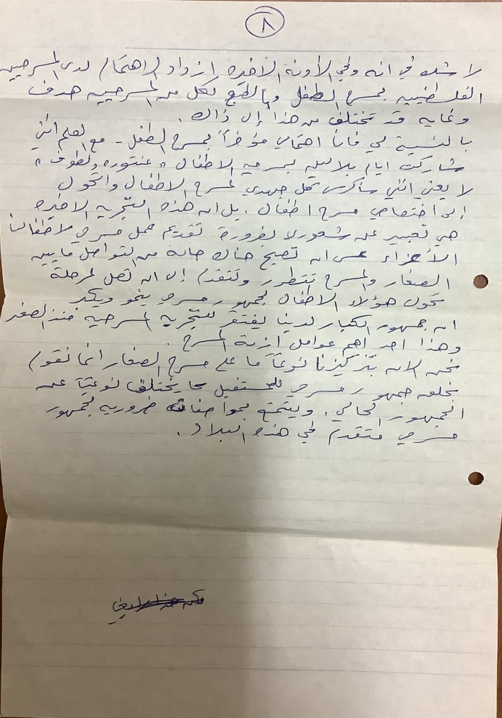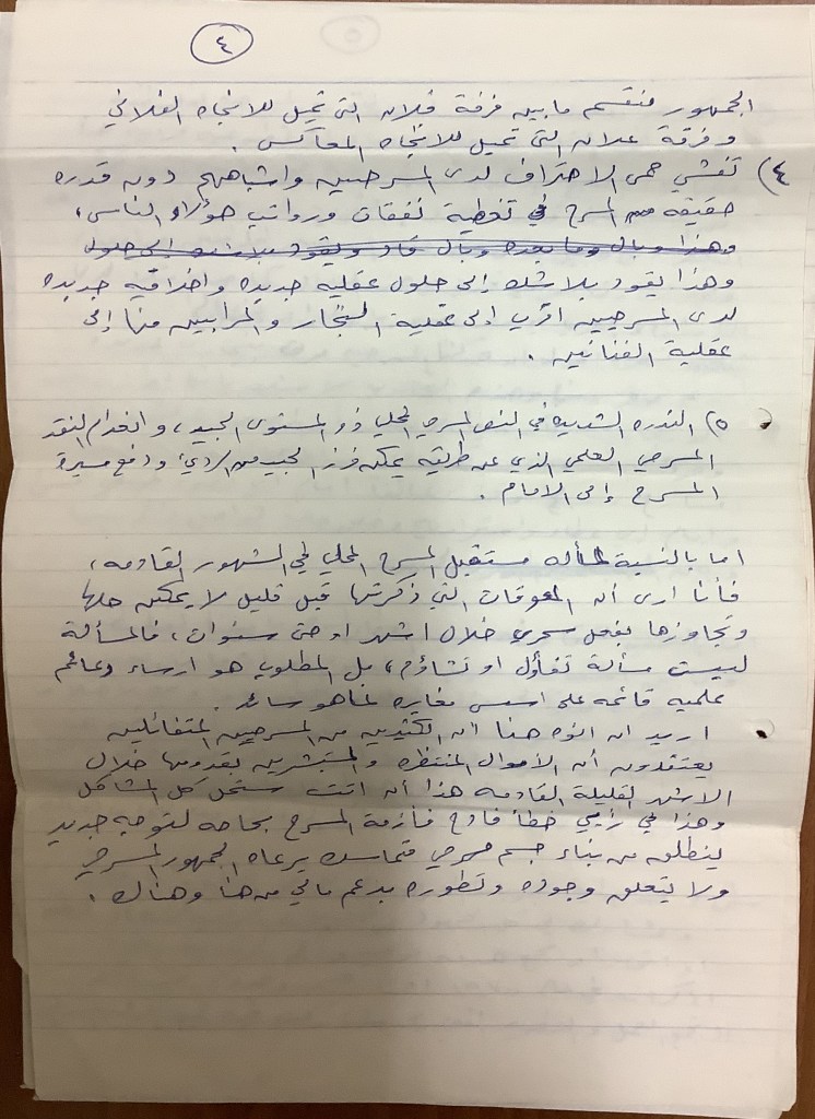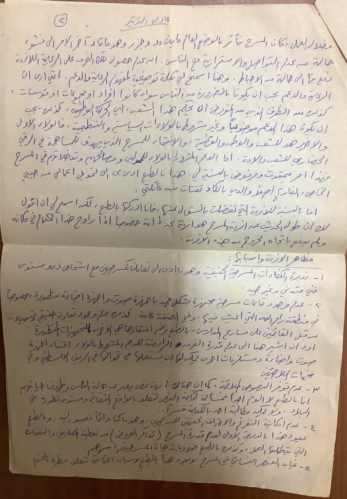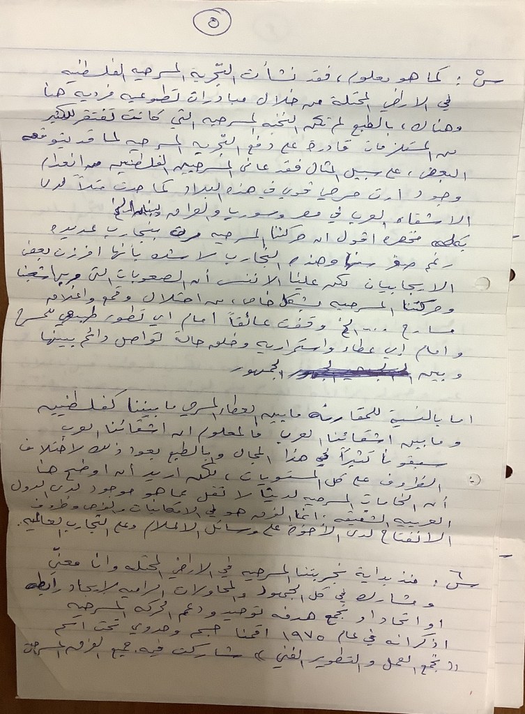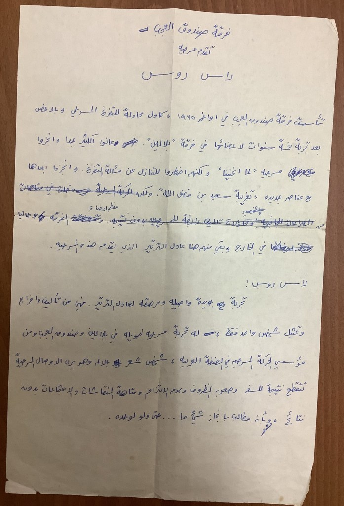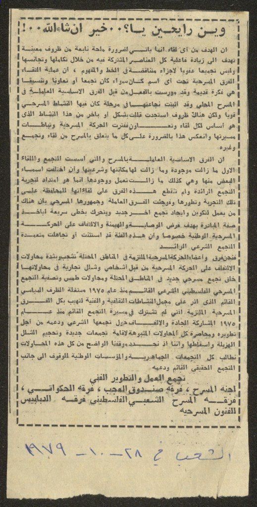 رسالة من كريم خلف إلى الفرق العاملة في تجمع العمل والتطوير الفني – لجنة المسرح، 1979