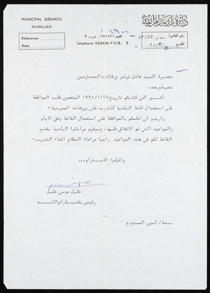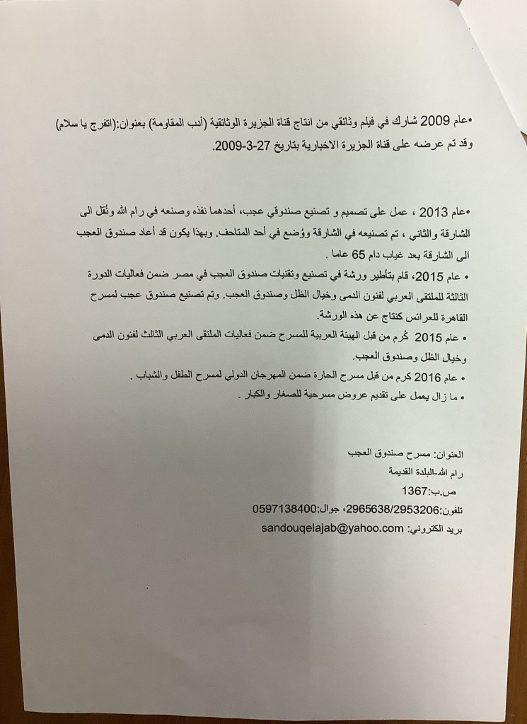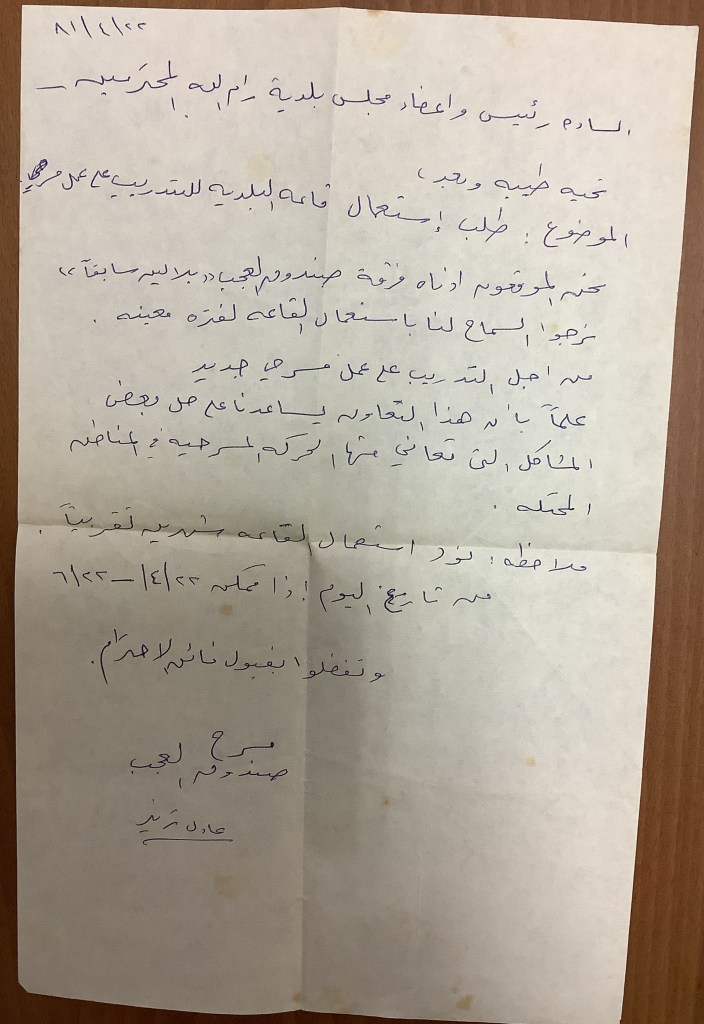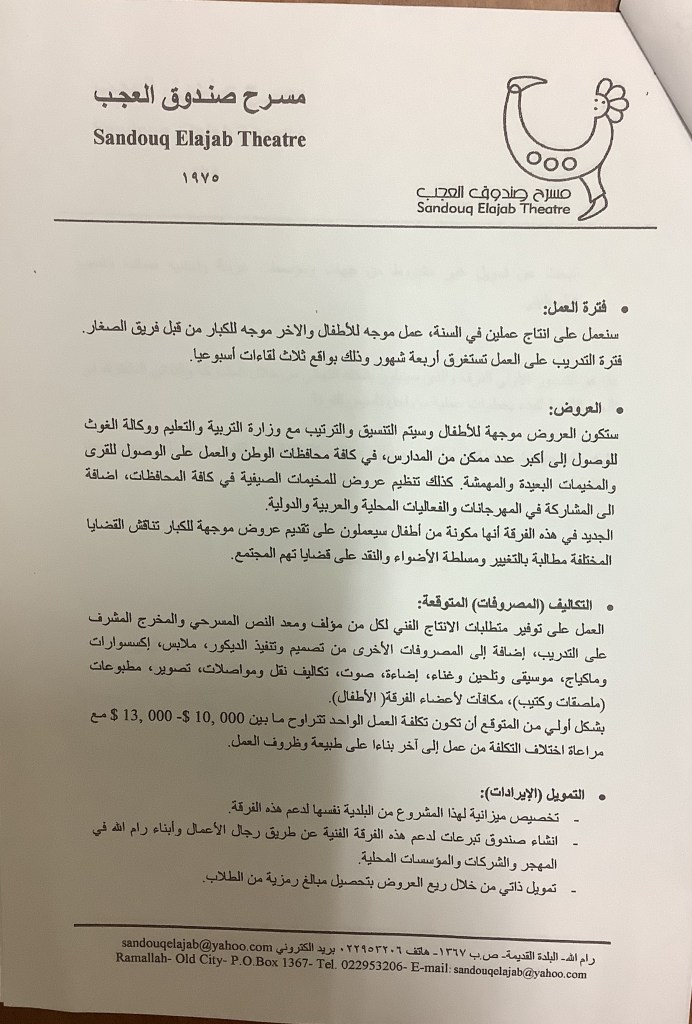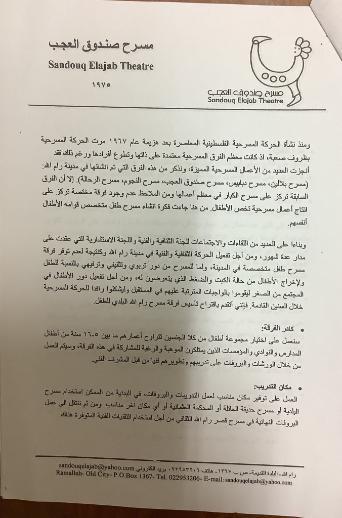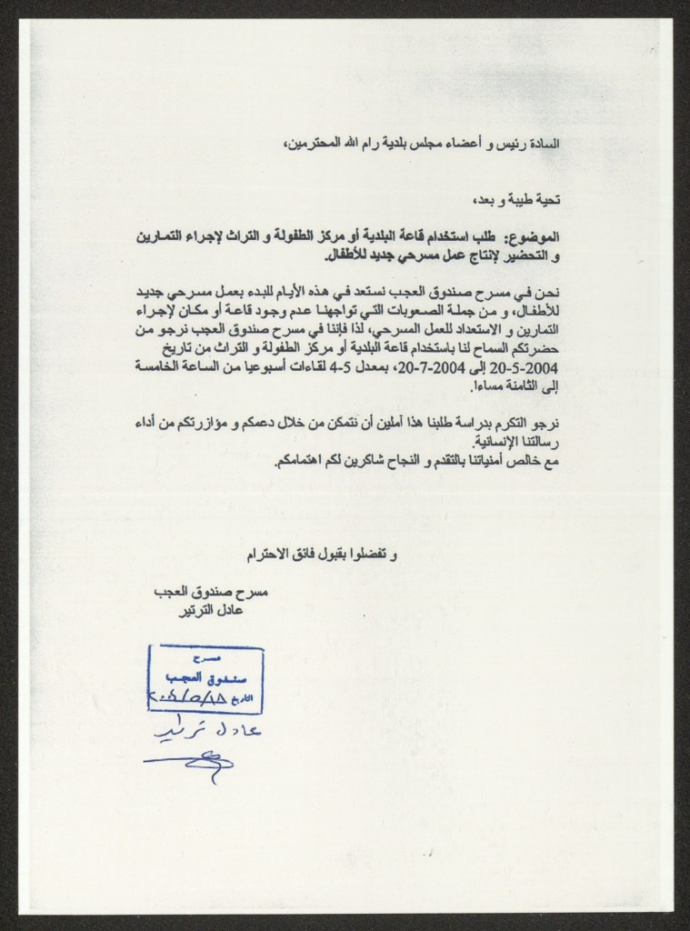 كتاب من مسرح صندوق العجب إلى مجلس بلدية رام الله، 10 تموز 2004
