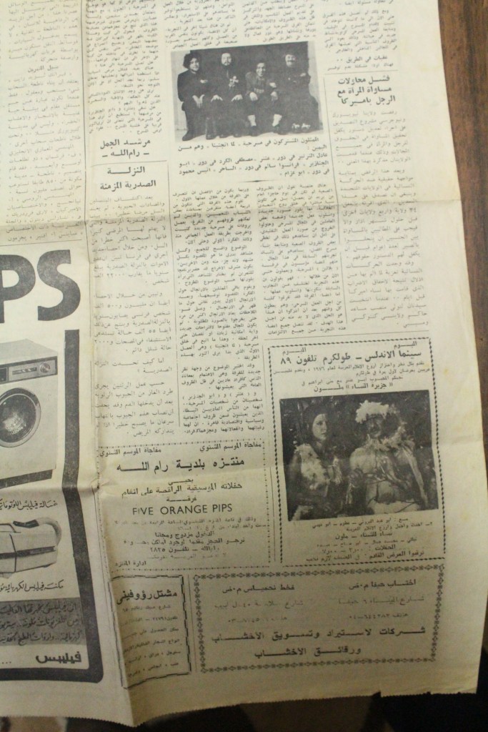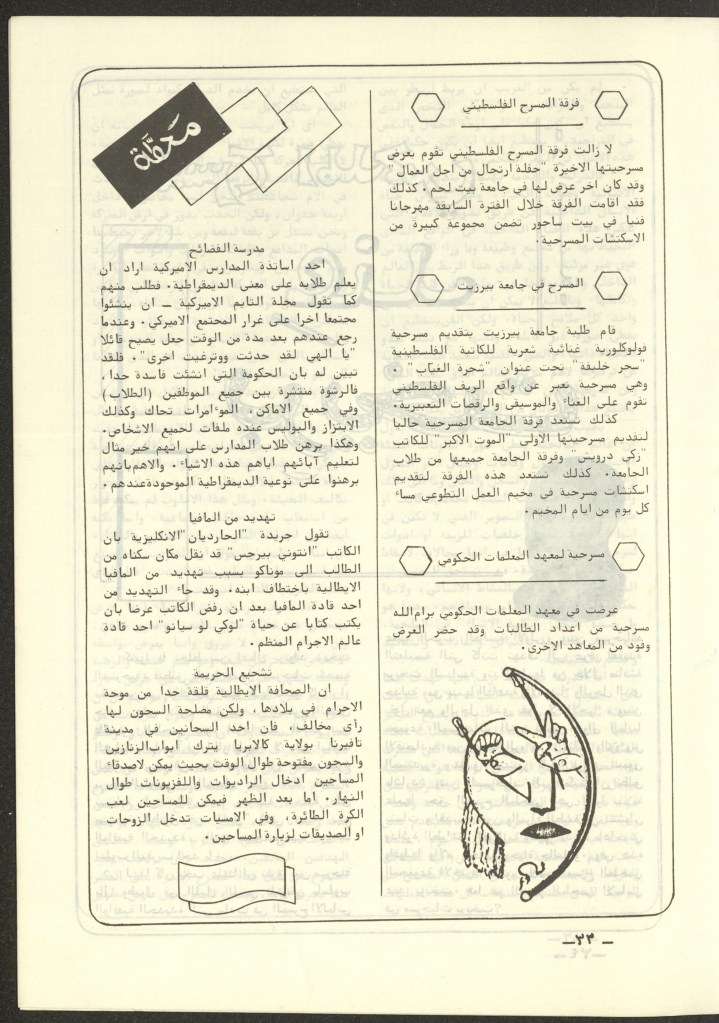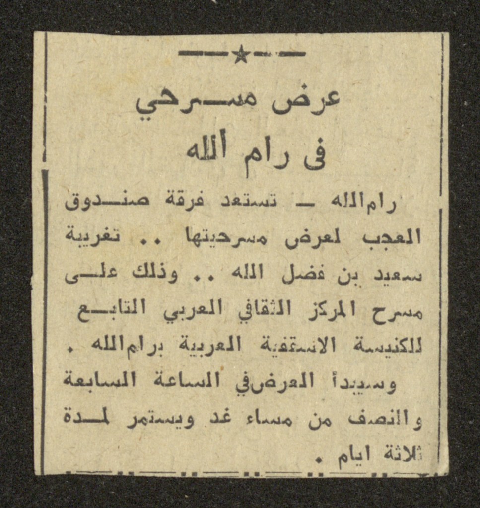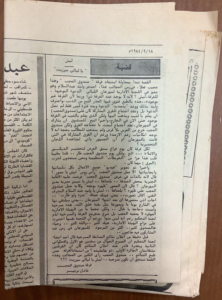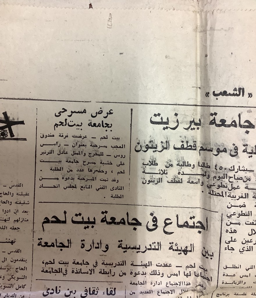 “عرض مسرحي بجامعة بيت لحم”، قصاصة من جريدة، 31 تشرين الأول 1980