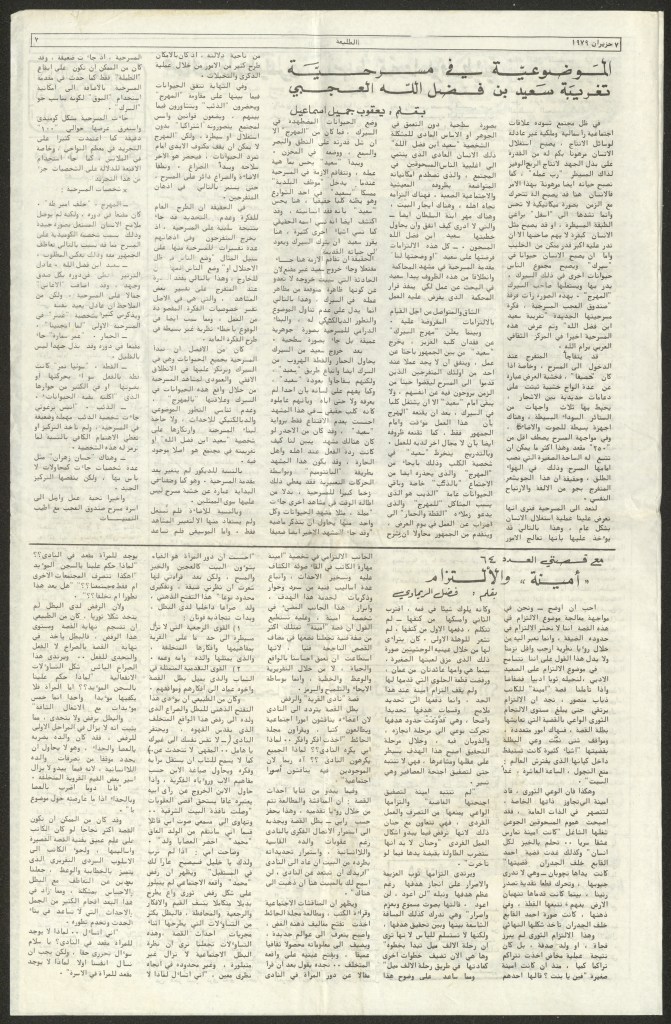 “مسرحية تغريبة سعيد بن فضل الله.. عمل مسرحي جاد وناجح”، قصاصة من جريدة، 31 تموز 1981