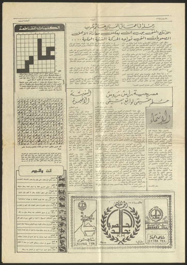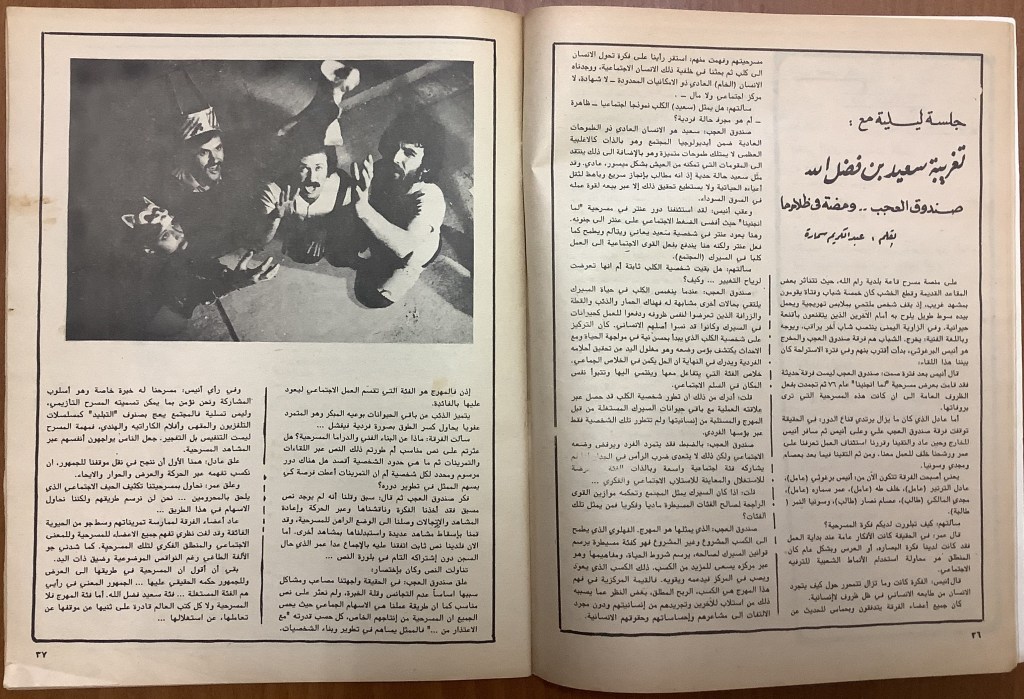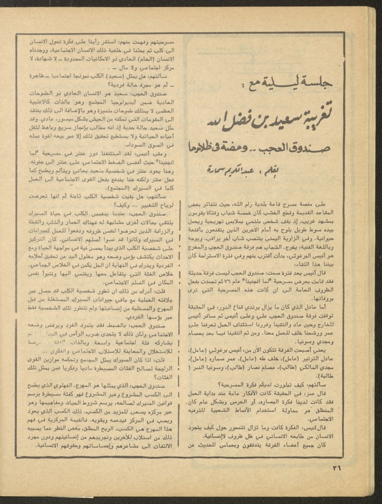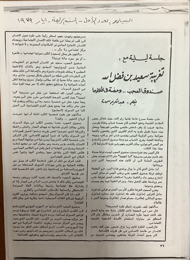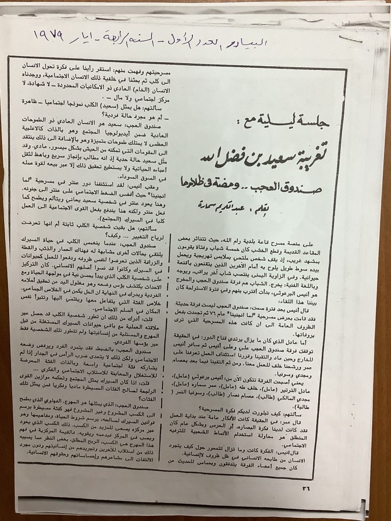 “كلمة من المحرر”، قصاصة من جريدة، 24 تموز 1981 مجموعة عادل الترتير 24 يوليو 1981 “صندوق العجب تعرض تغريبة سعيد بن فضل الله في عمان”، قصاصة من جريدة، 8 تموز 1981
