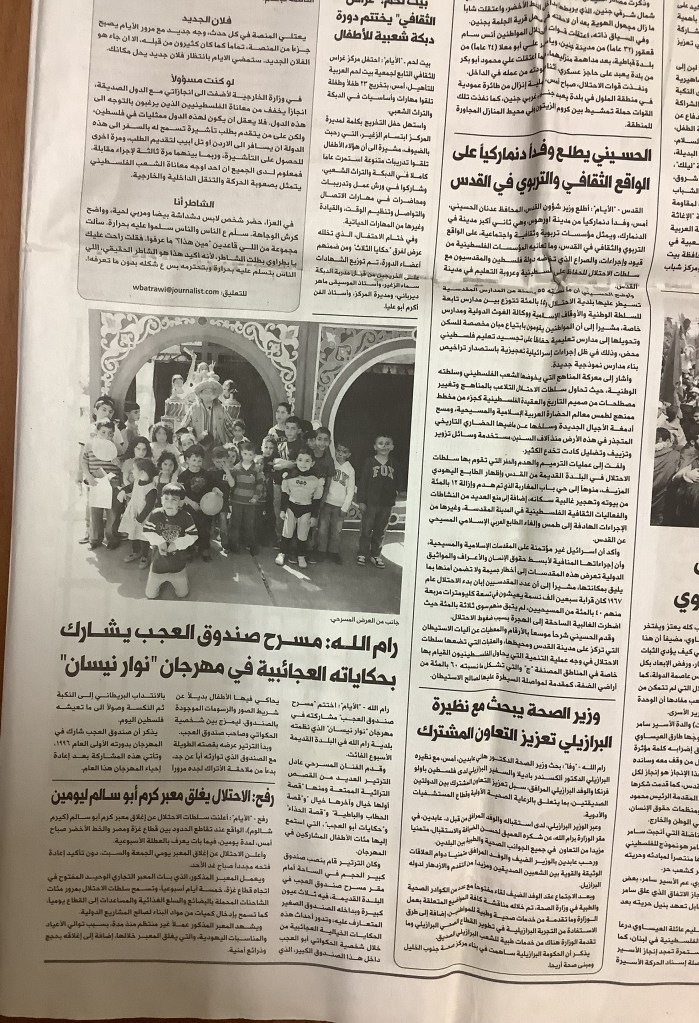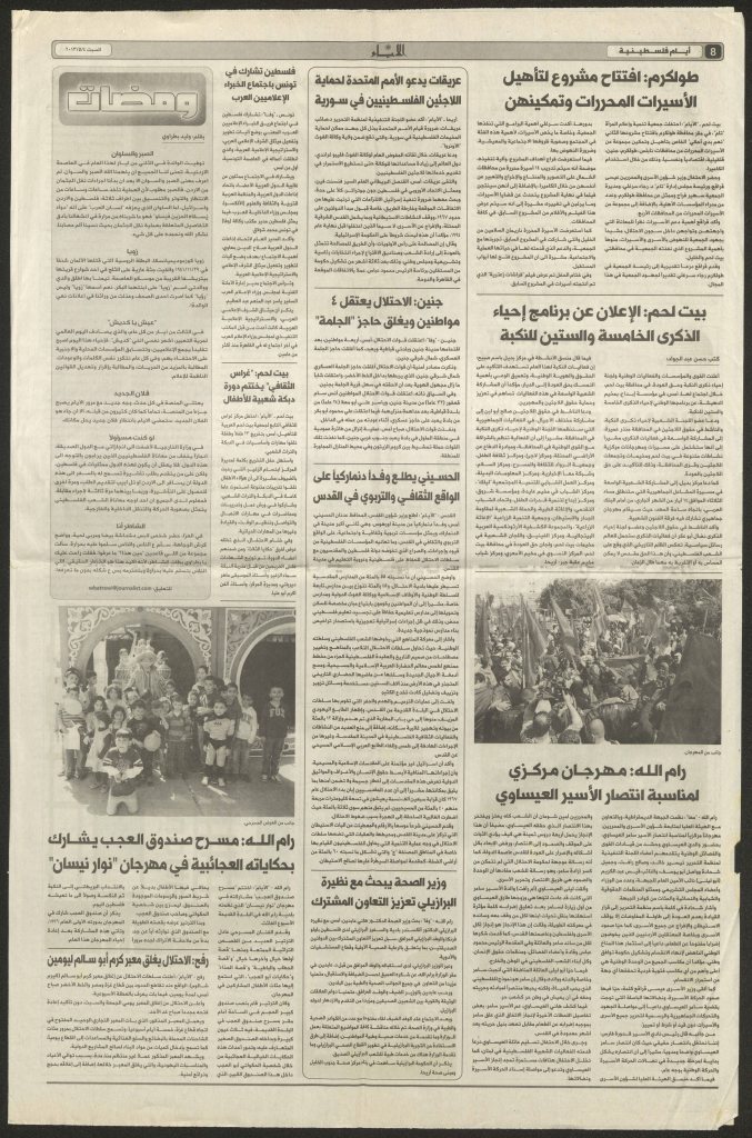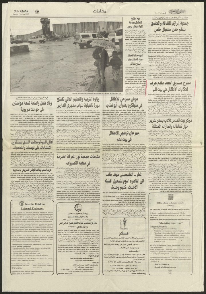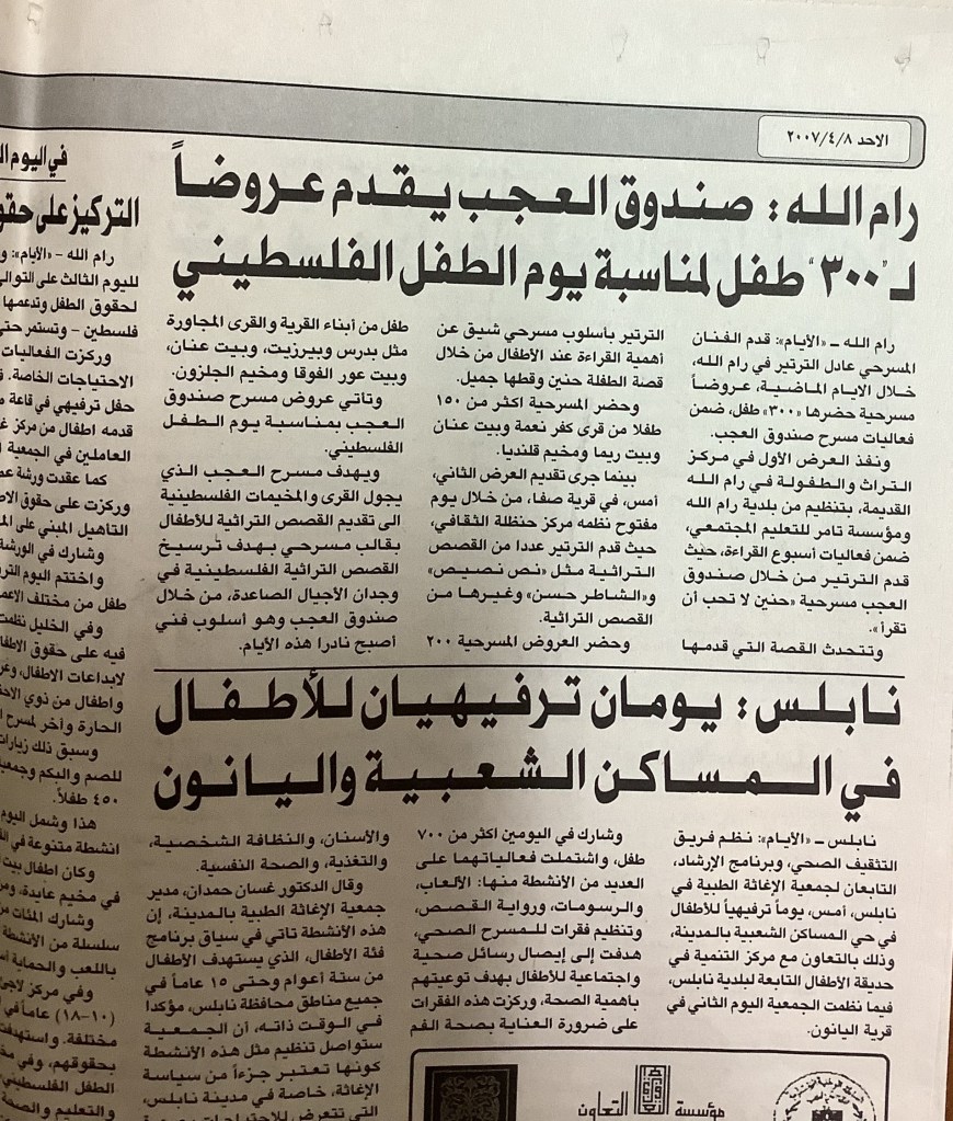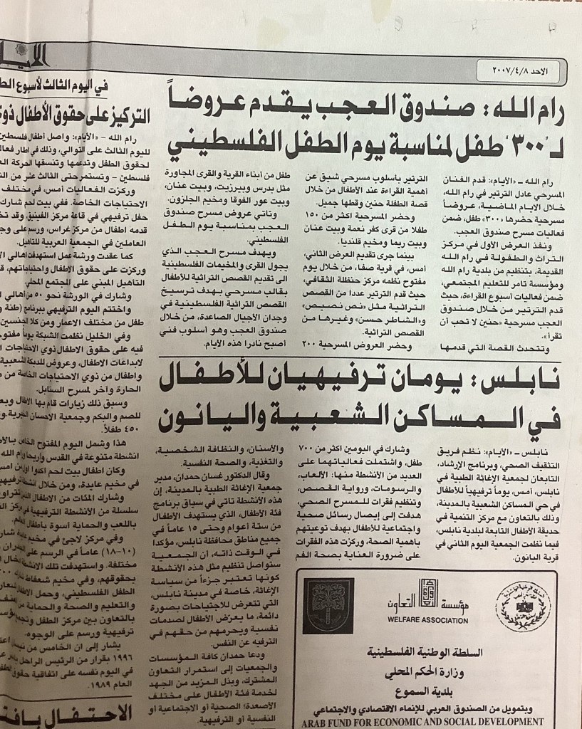 “رام الله: صندوق العجب يقدم عروضًا لـ300 طفل لمناسبة يوم الطفل الفلسطيني”، قصاصة من جريدة، 8 نيسان 2007