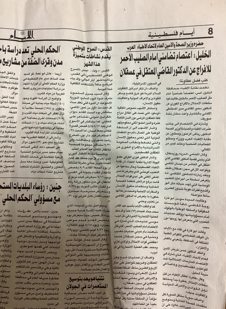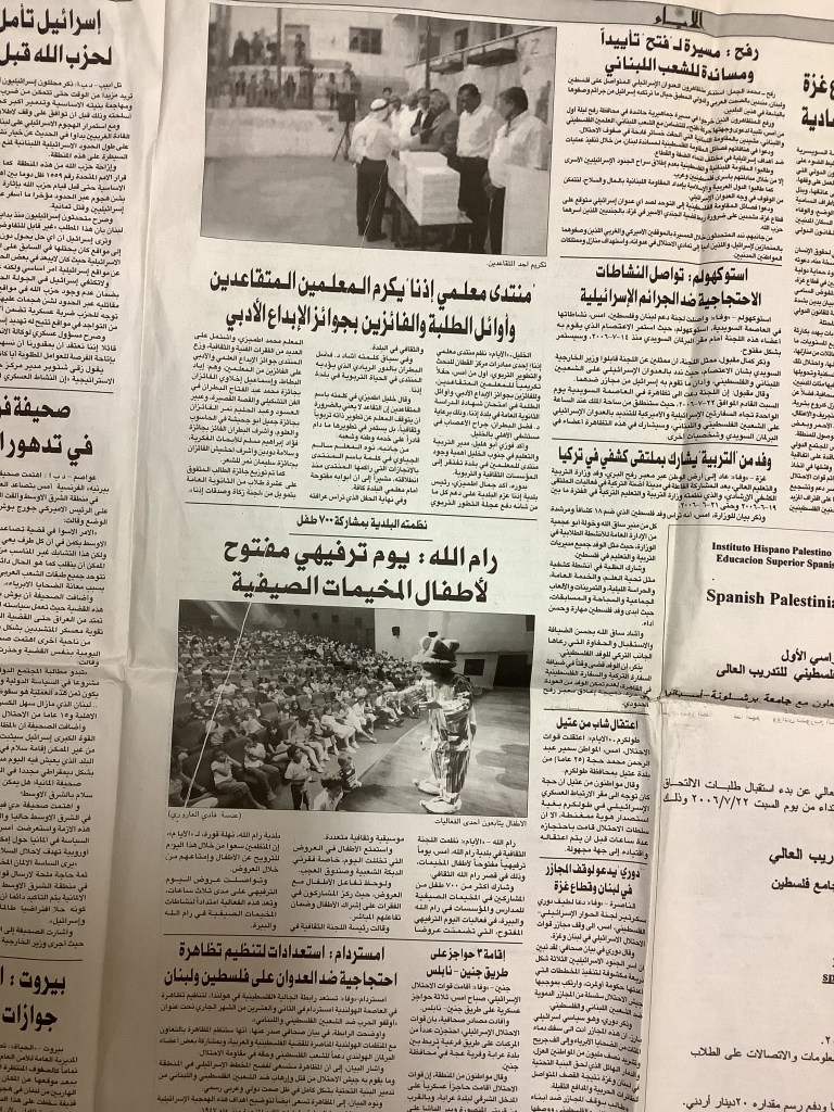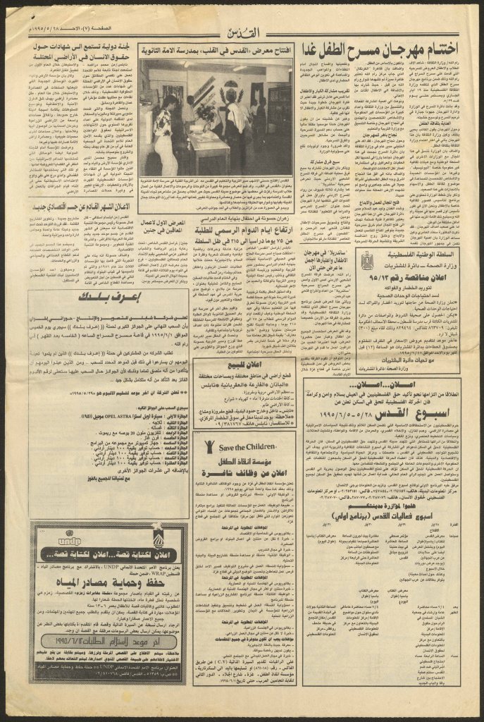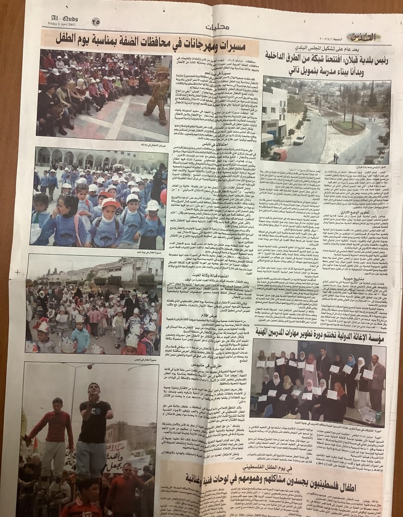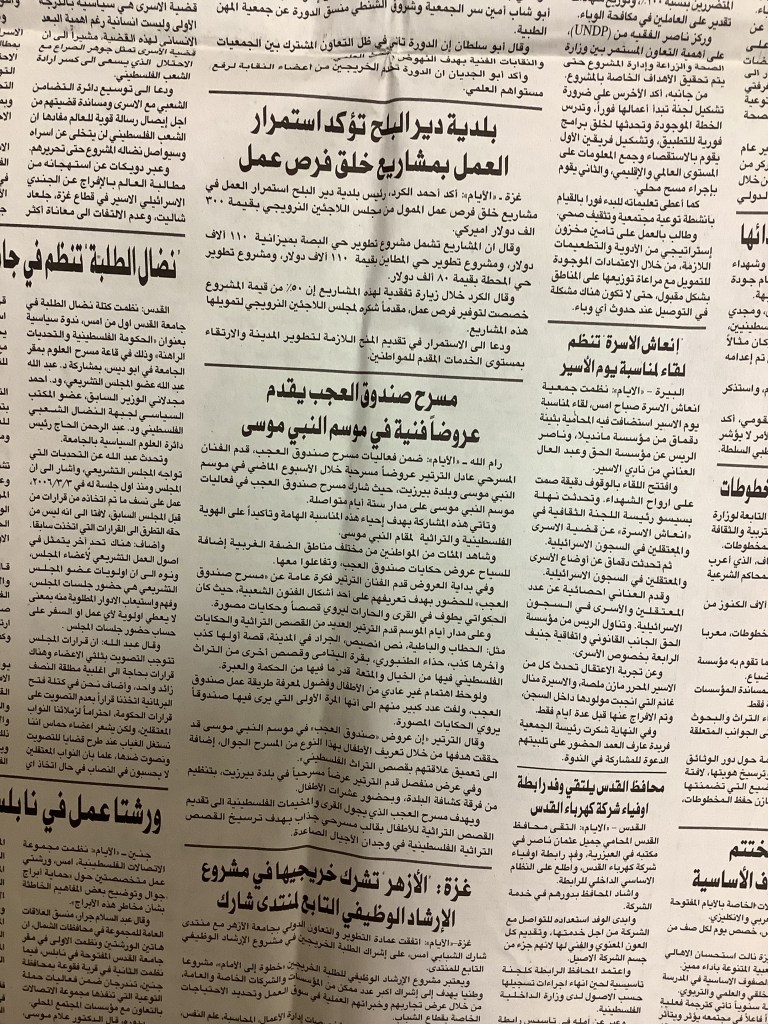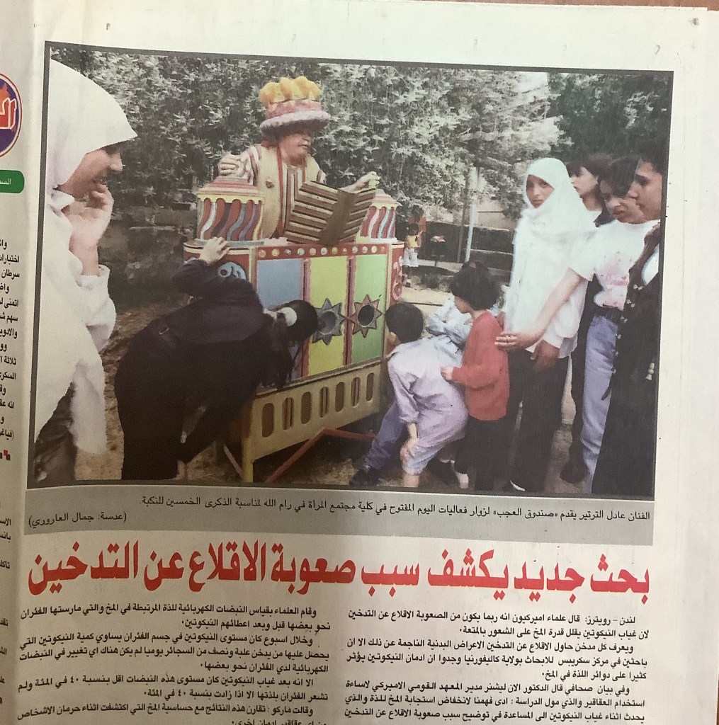 “رام الله: صندوق العجب يقدم عروضًا لـ300 طفل لمناسبة يوم الطفل الفلسطيني”، قصاصة من جريدة، 8 نيسان 2007