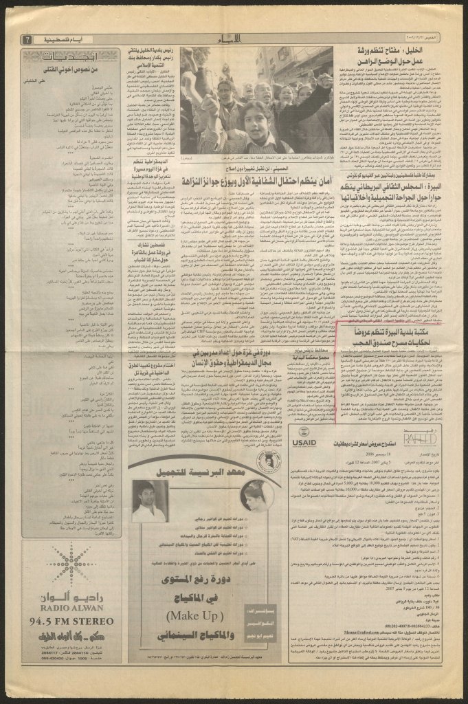 “مكتبة البيرة تنظم عروضًا لحكايات صندوق العجب”، قصاصة من جريدة، 21 كانون الأول 2006