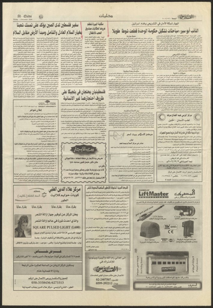 “مكتبة البيرة تنظم عروضًا لحكايات صندوق العجب”، قصاصة من جريدة، 1 كانون الأول 2006