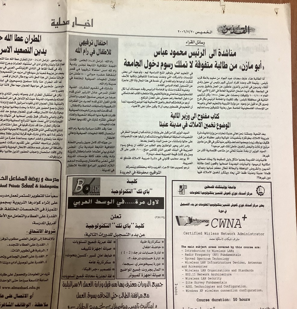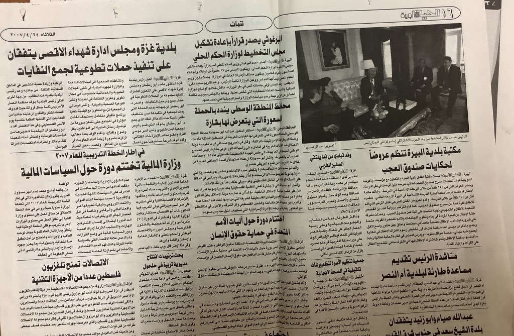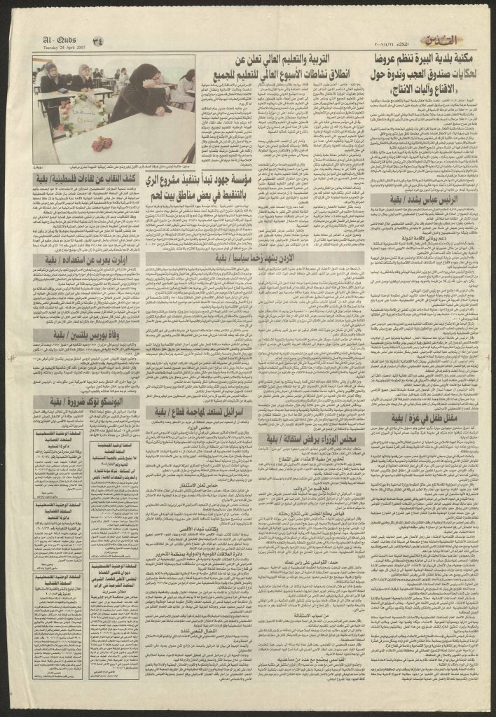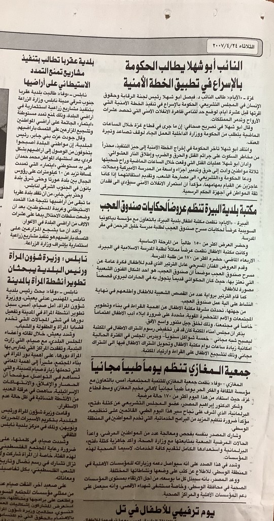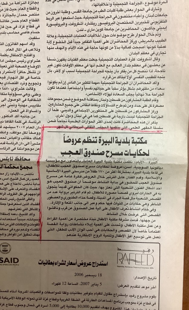 “مكتبة بلدية البيرة تنظم عروضًا لحكايات صندوق العجب”، قصاصة من جريدة، 24 نيسان 2007