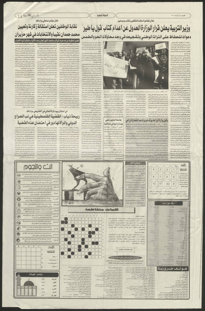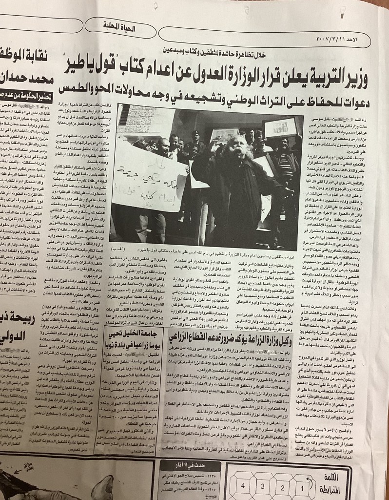 “وزير التربية يعلن قرار الوزارة العدول عن إعدام كتاب قول يا طير”، قصاصة من جريدة، 11 آذار 2007