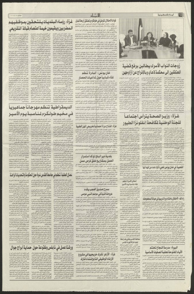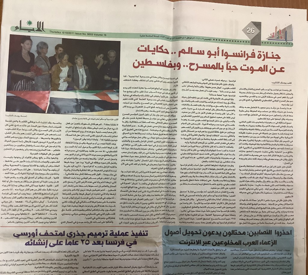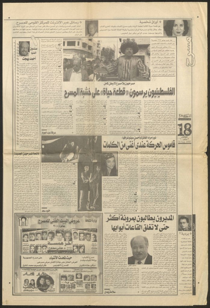 “الفلسطينيون يرسمون قطعة حياة على خشبة المسرح”، قصاصة من جريدة، 26 أيلول 2000