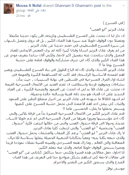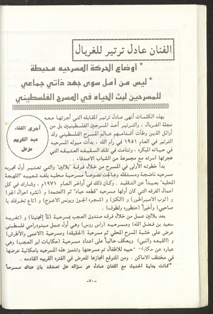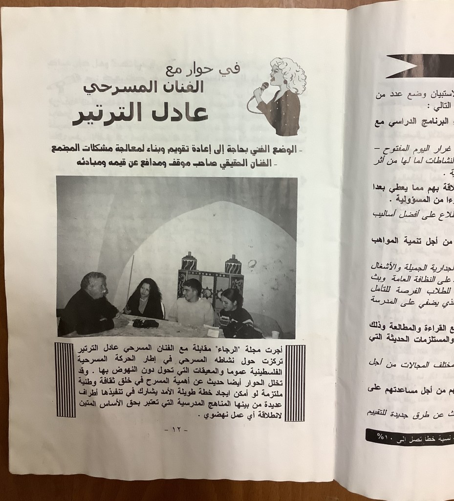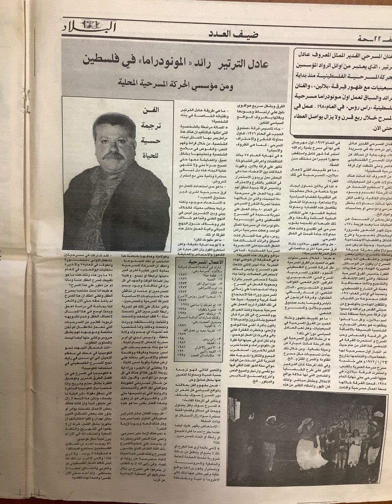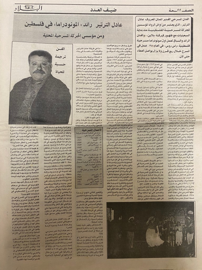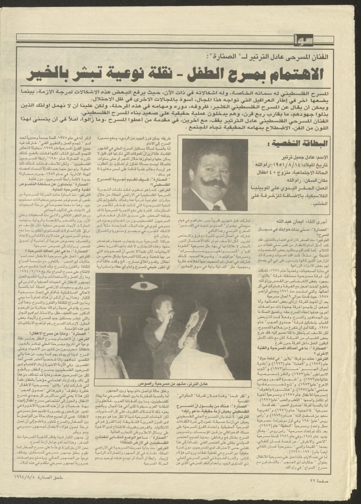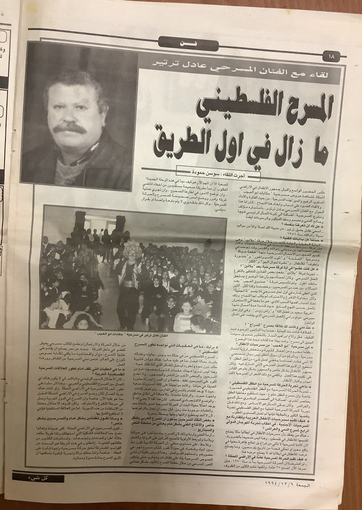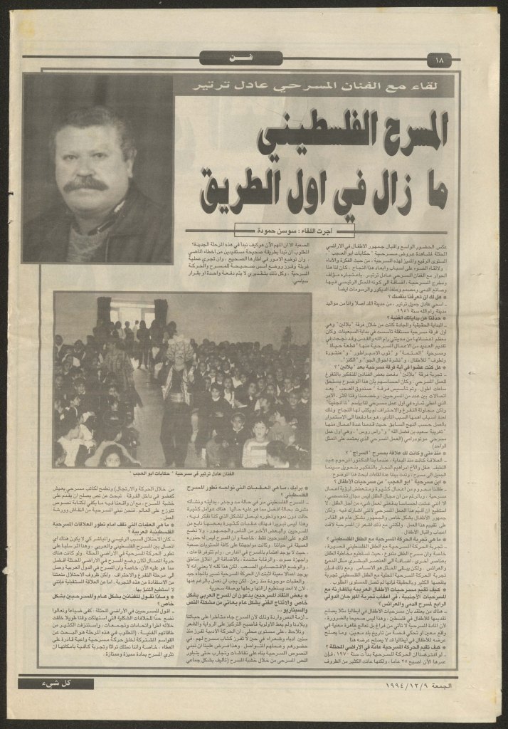 “المسرح الفلسطيني ما زال في أول الطريق”، مقابلة مع الفنان المسرحي عادل الترتير، 9 كانون الأول 1994