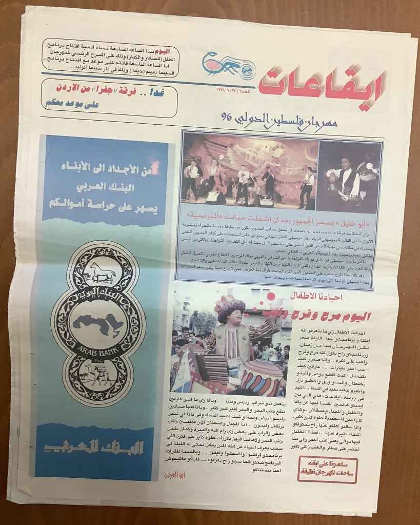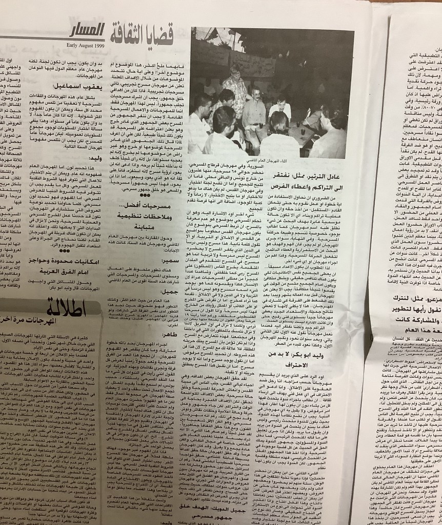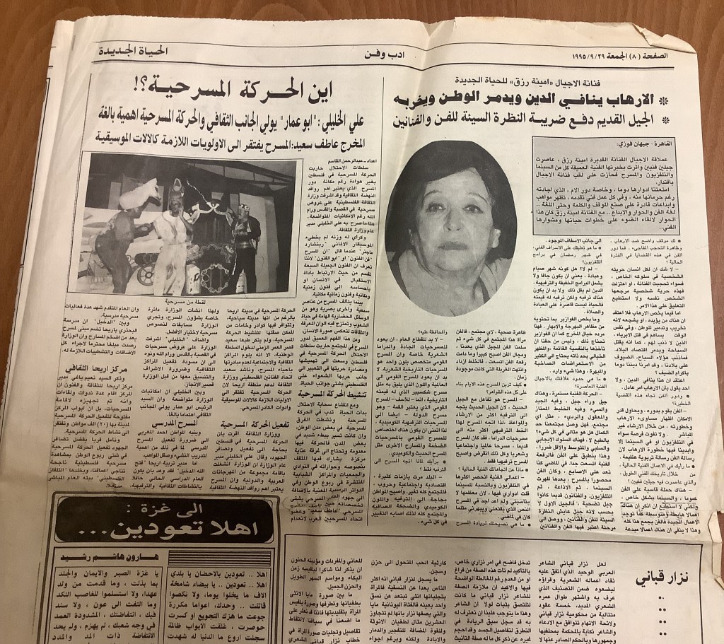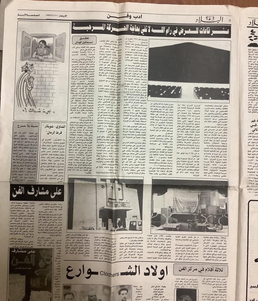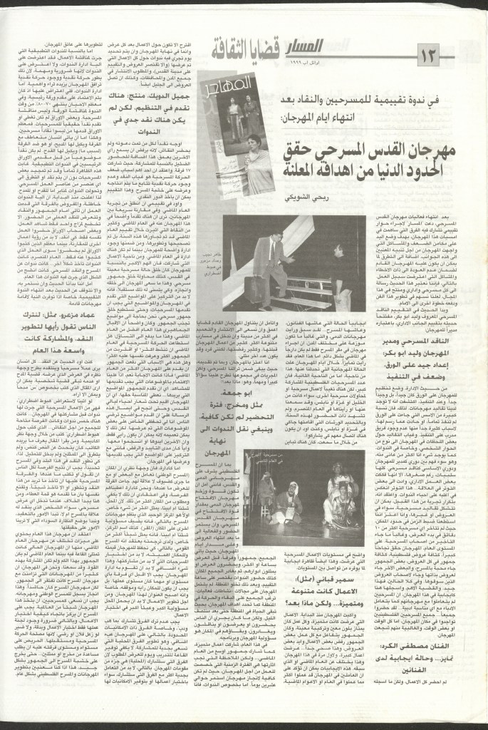 “باقة من العروض على خشبة المسرح الوطني الفلسطيني”، قصاصة من جريدة، 14 أيلول 1998