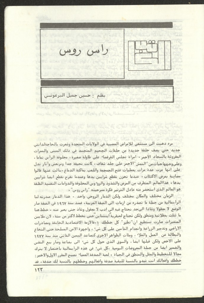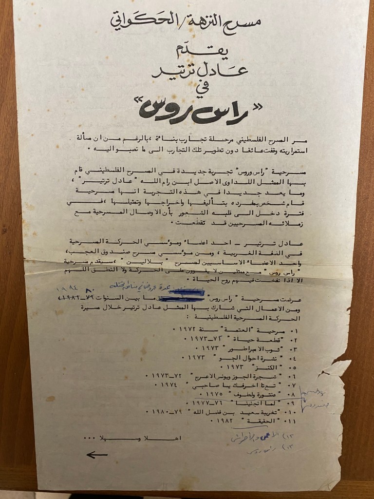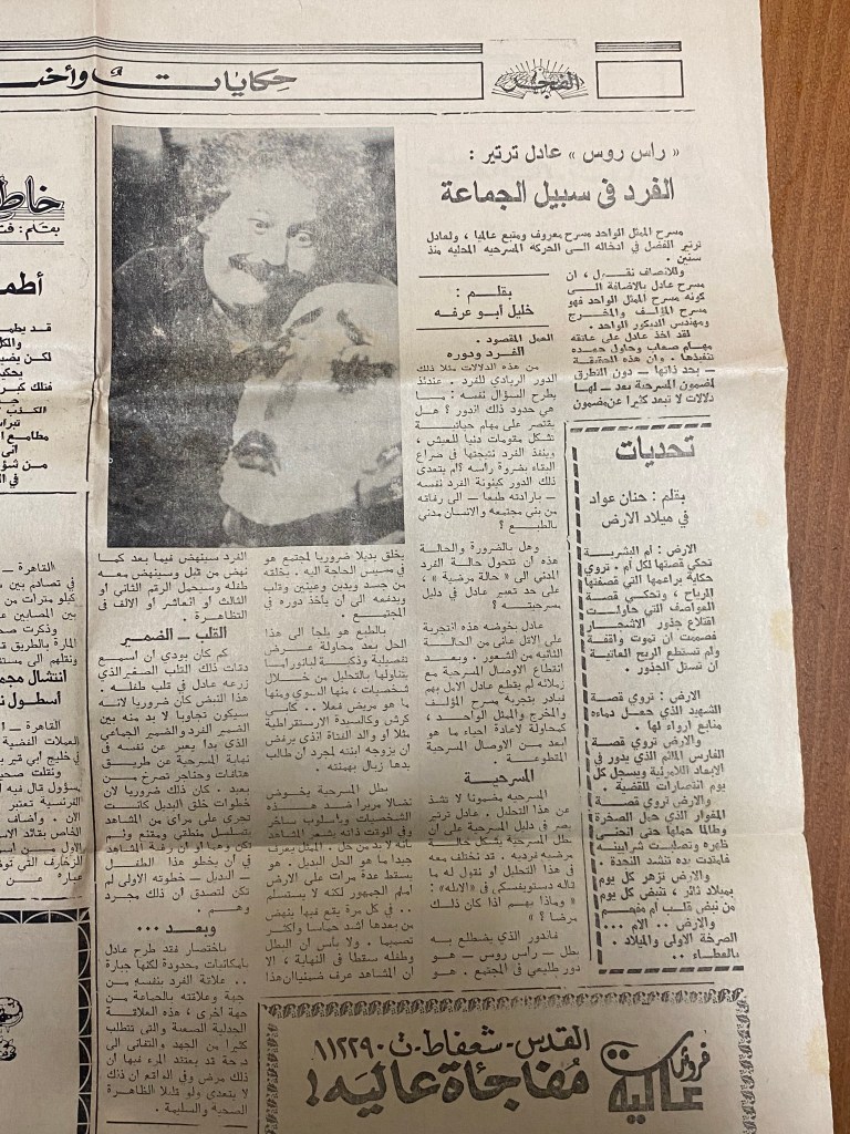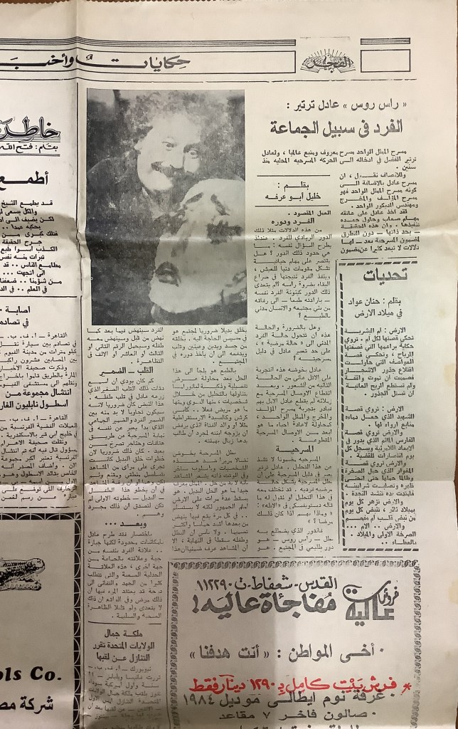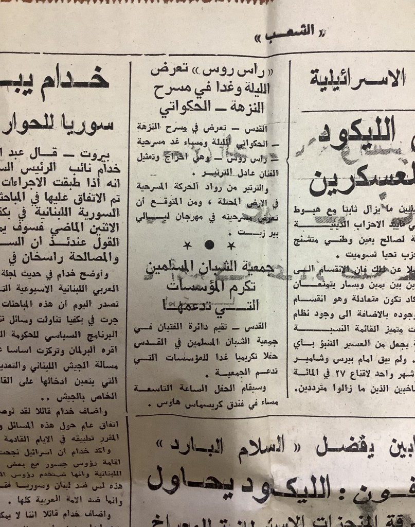 “راس روس تعرض الليلة وغدًا في مسرح النزهة- الحكواتي”، قصاصة من جردية، القدس، 23 حزيران 1984
