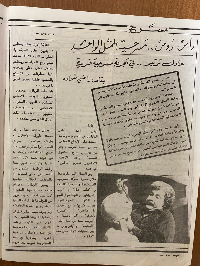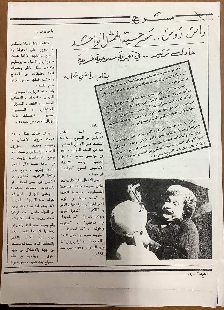 “مسرحية راس روس، عرضها في قلنديا”، قصاصة من جريدة، القدس، 1 آذار 1981