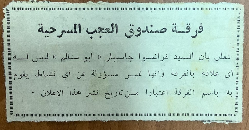 “فرقة صندوق العجب تقدم مسرحية الأعمى والأطرش”، قصاصة ورقية، 28 حزيران 1986