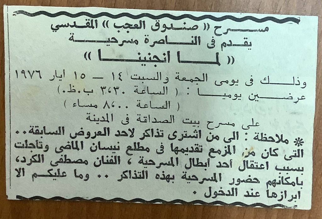 تذكرة الدخول لمسرحية “لمّا انجنينا”، 1976