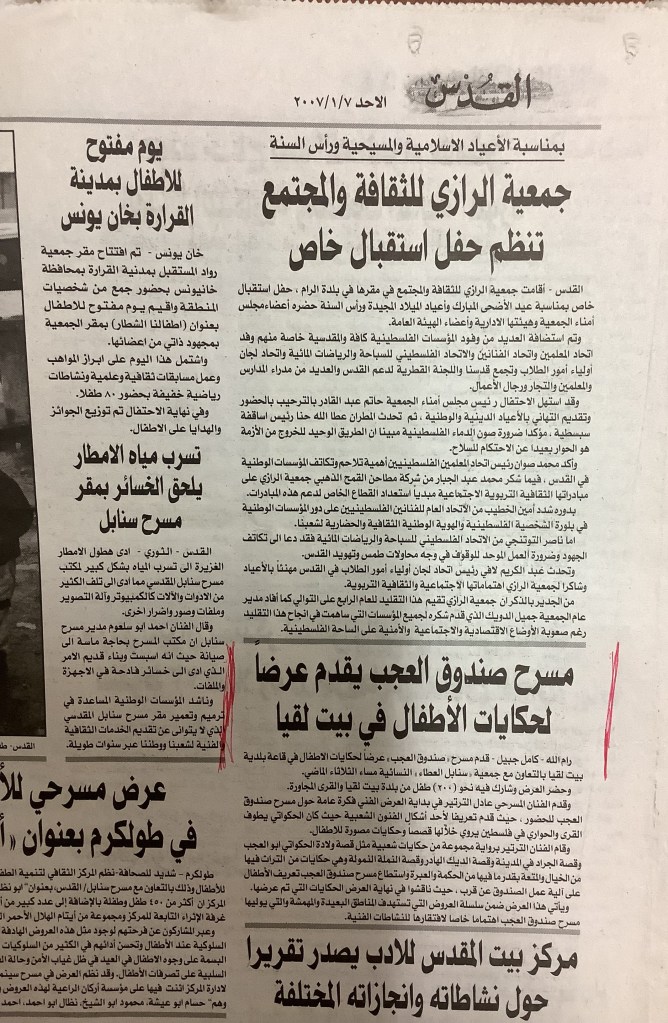 “مسرح صندوق العجب يقدم لحكايات الأطفال في بيت لقيا”، قصاصة من جريدة، 7 كانون الثاني 2007