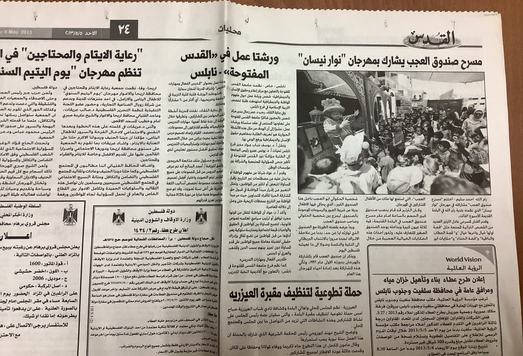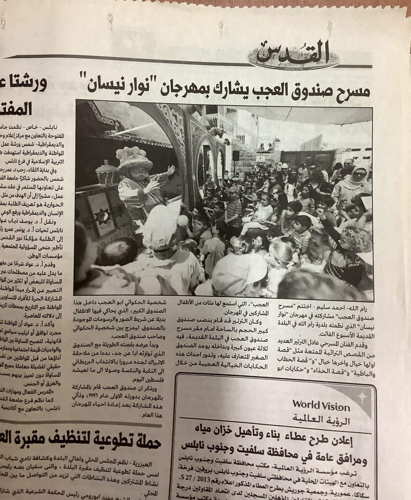 “رام الله: مسرح صندوق العجب يشارك بحكاياته العجائبية في مهرجان نوار نيسان”، قصاصة من جريدة، 4 أيار 2013