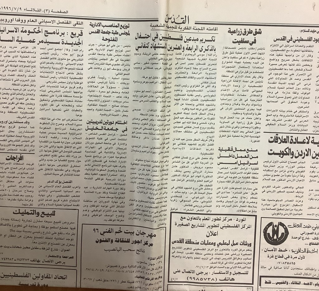 “في الذكرى الخامسة والعشرين لاستشهاد الكاتب الفلسطيني غسان كنفاني”، قصاصة من جريدة، 8 تموز 1997