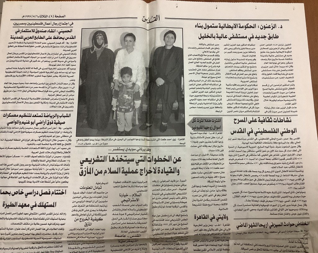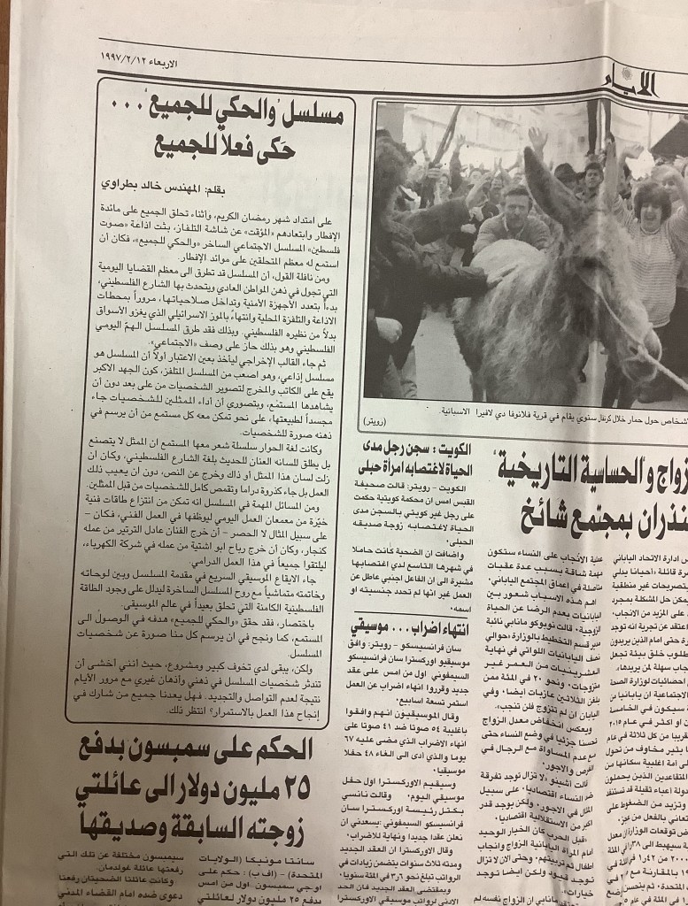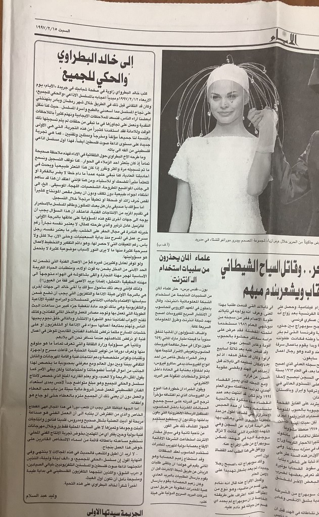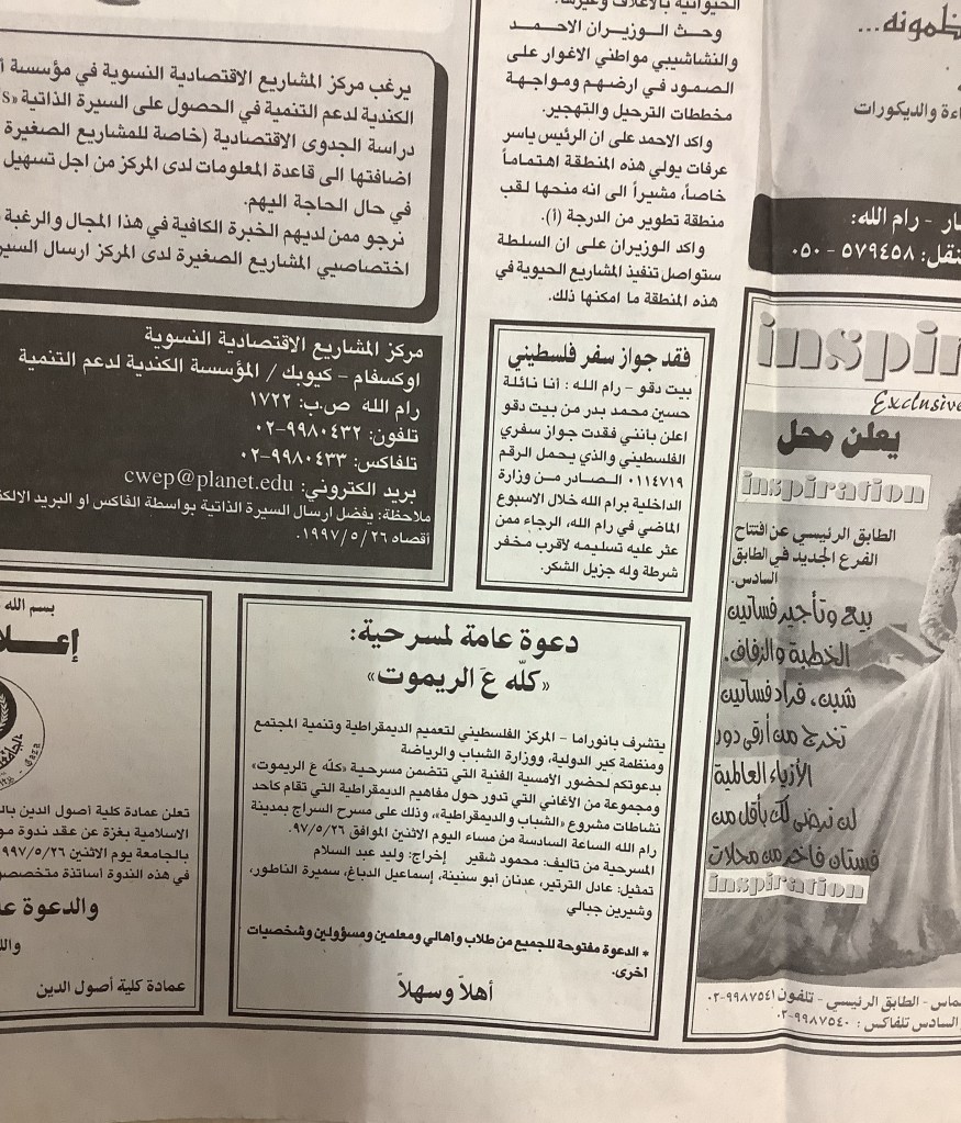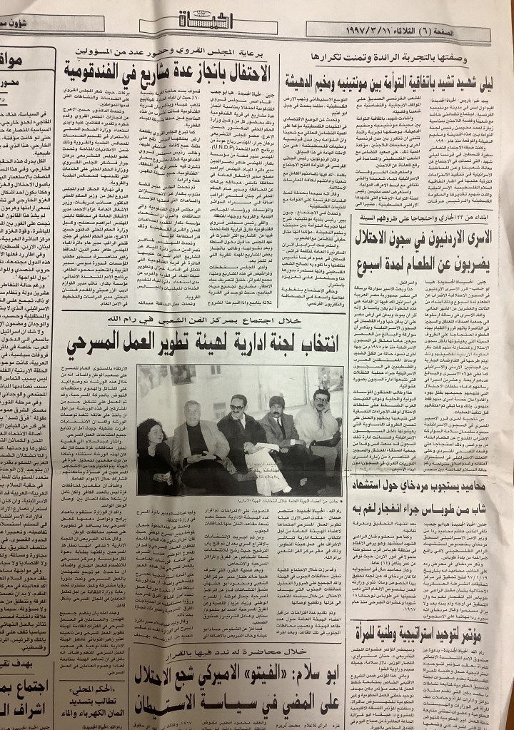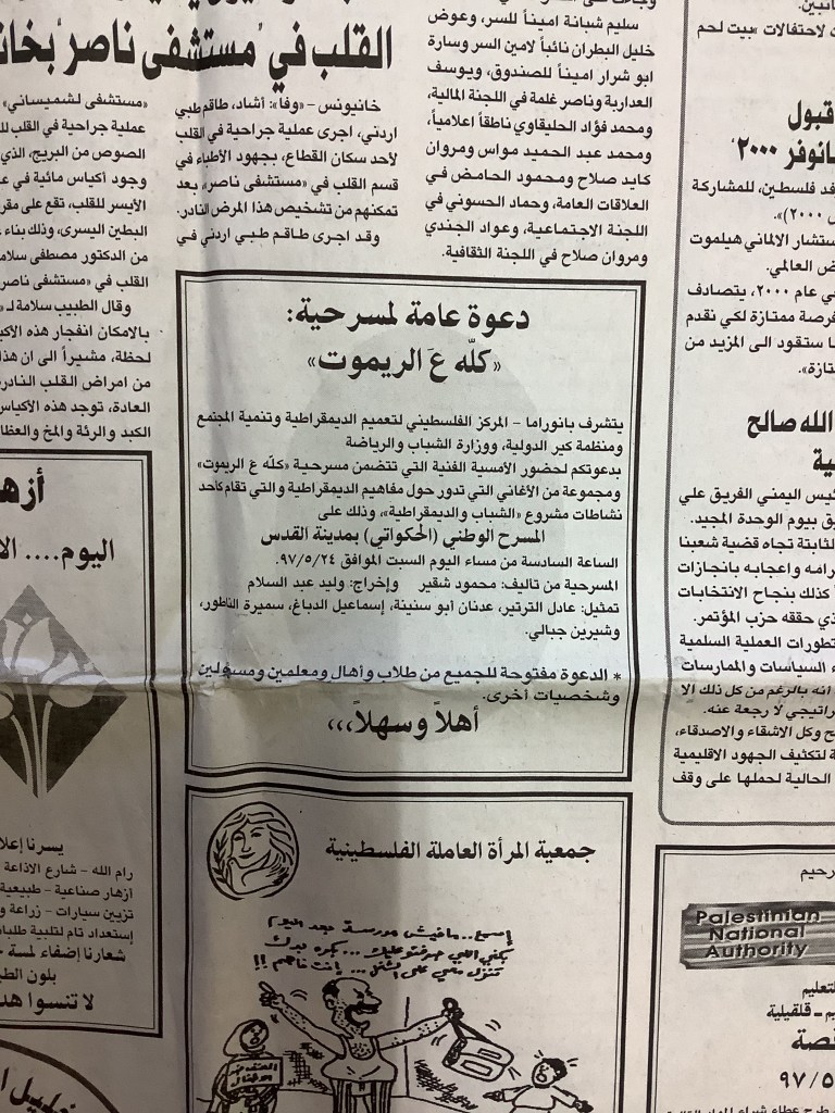 “عرض مسرحي في الخليل”، قصاصة من جريدة، 15 شباط 1997