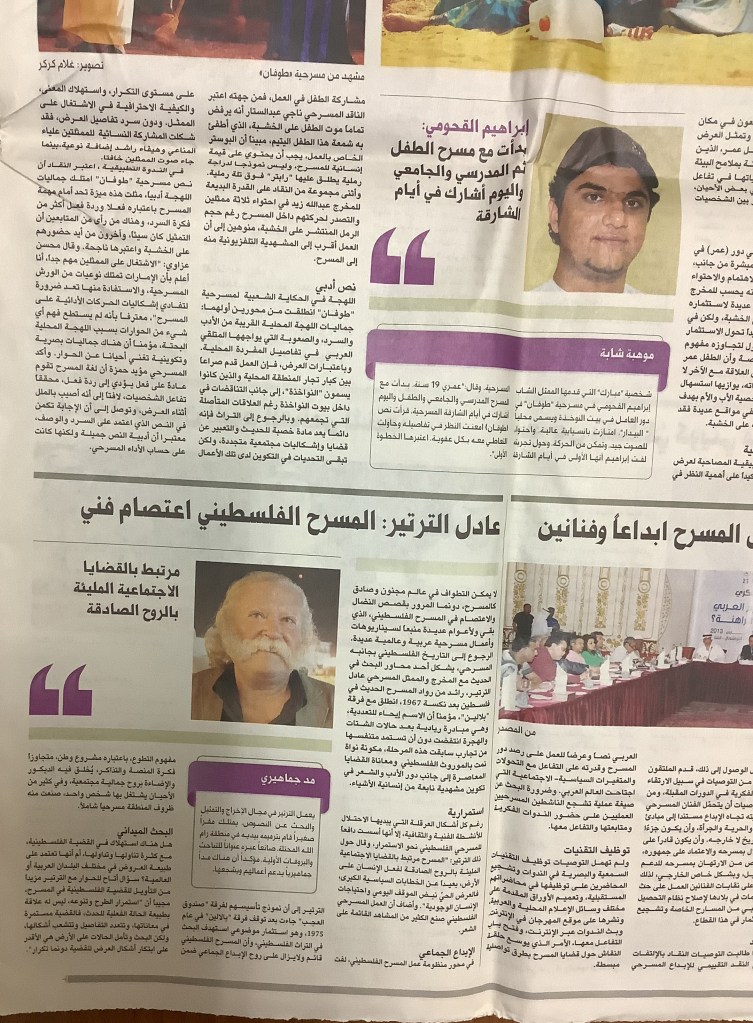 “عادل الترتير: المسرح الفلسطيني اعتصام فني”، قصاصة من جريدة، الشارقة، 21 آذار 2013