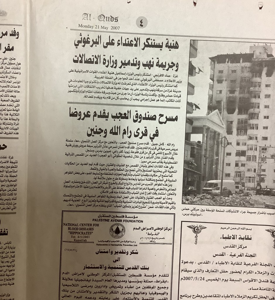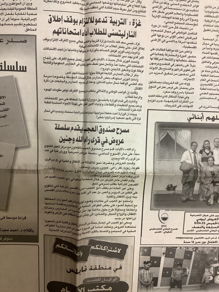 “مسرح صندوق العجب يقدم سلسلة عروض في قرى رام الله وجنين”، قصاصة من جريدة، 21 أيار 2007