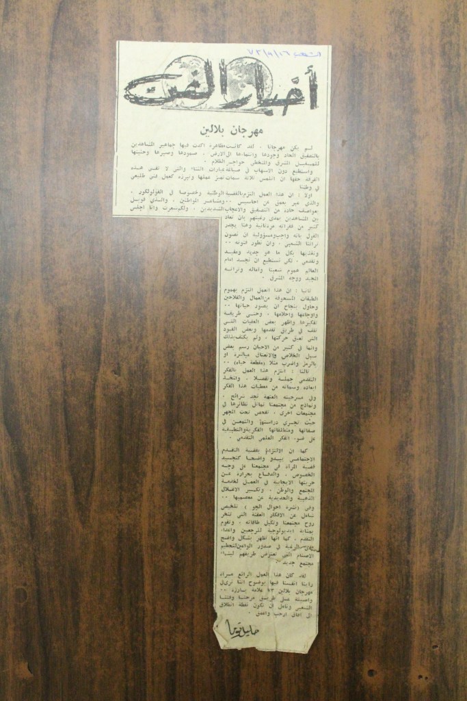 “مهرجان بلالين”، قصاصة ورقية صادرة عن صحيفة الفجِر، 4 آب 1973